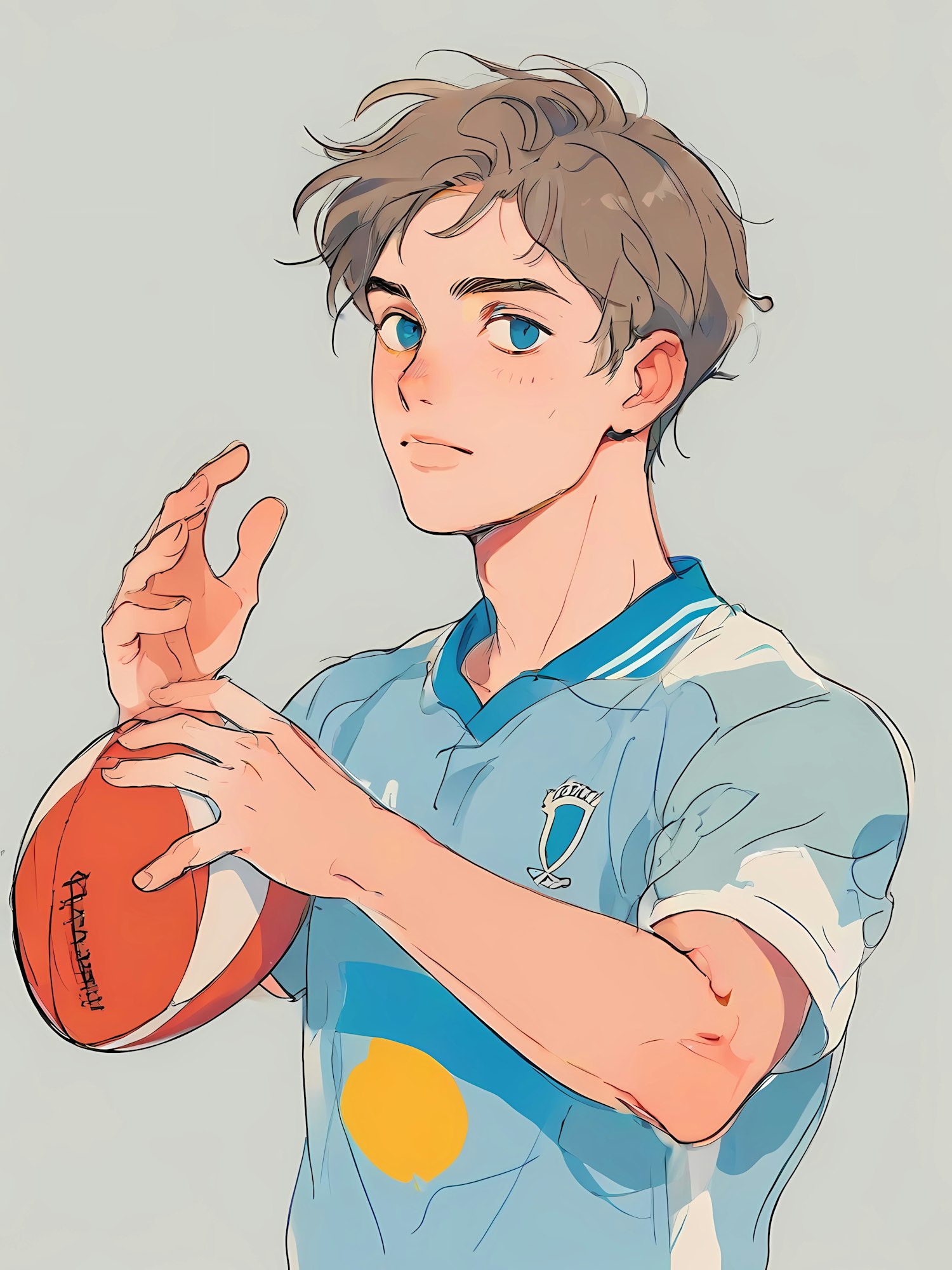 Stylized illustration of a young man with blue eyes holding a rugby ball, wearing a light blue jersey with white accents.