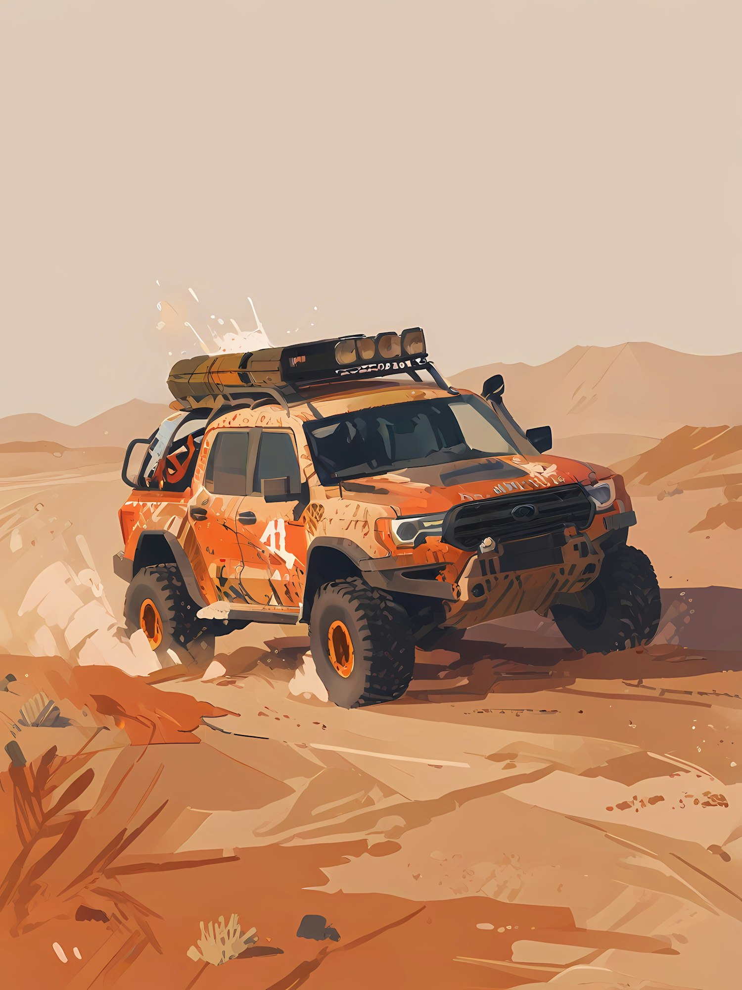 Vibrant orange off-road vehicle racing through a desert, equipped with rugged tires, roof rack, and rally number 41. Adventure vibes!