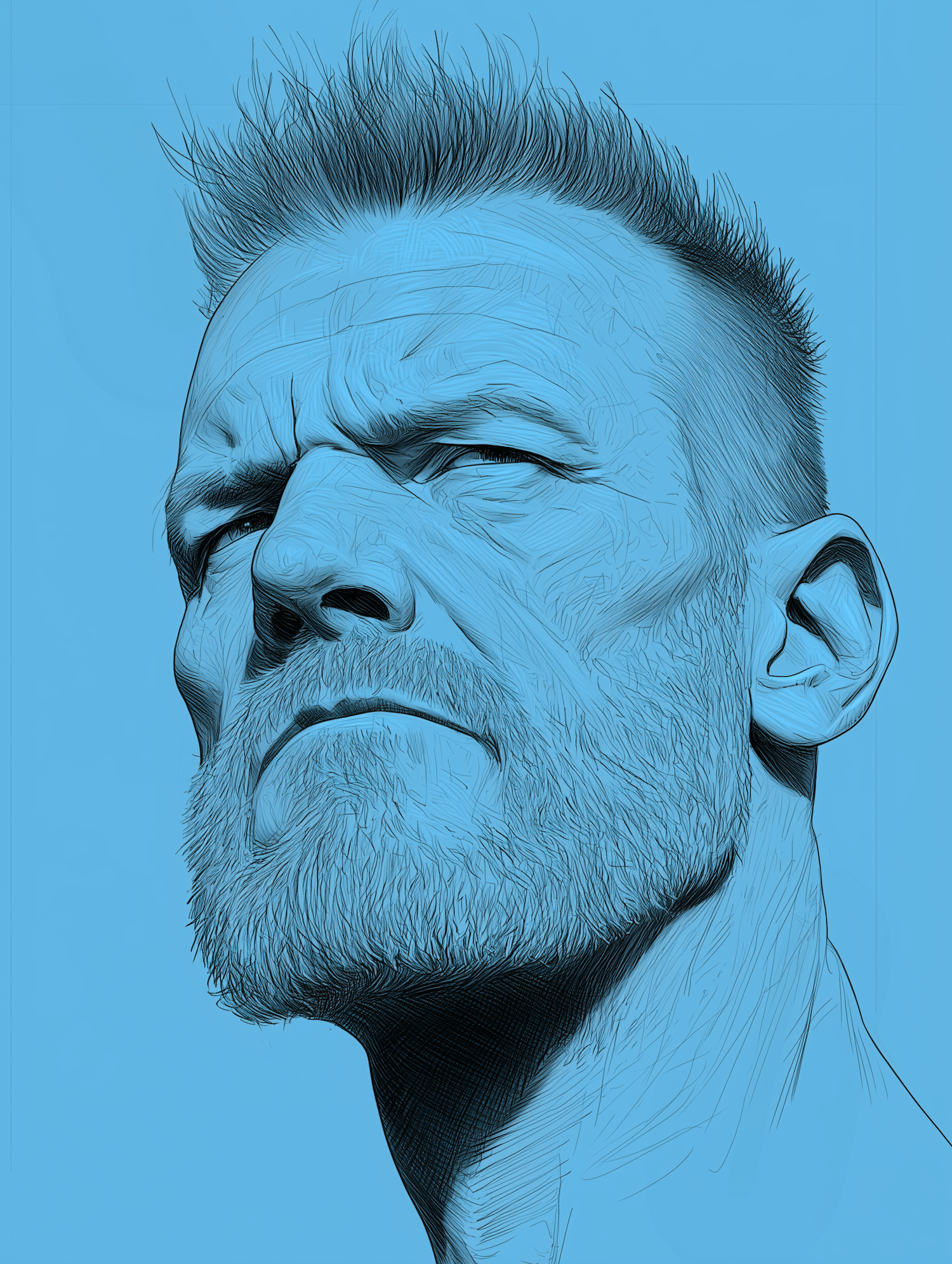Stylized blue illustration of a rugged man with a beard and spiky hair, showcasing detailed lines and shading for a modern artistic look.