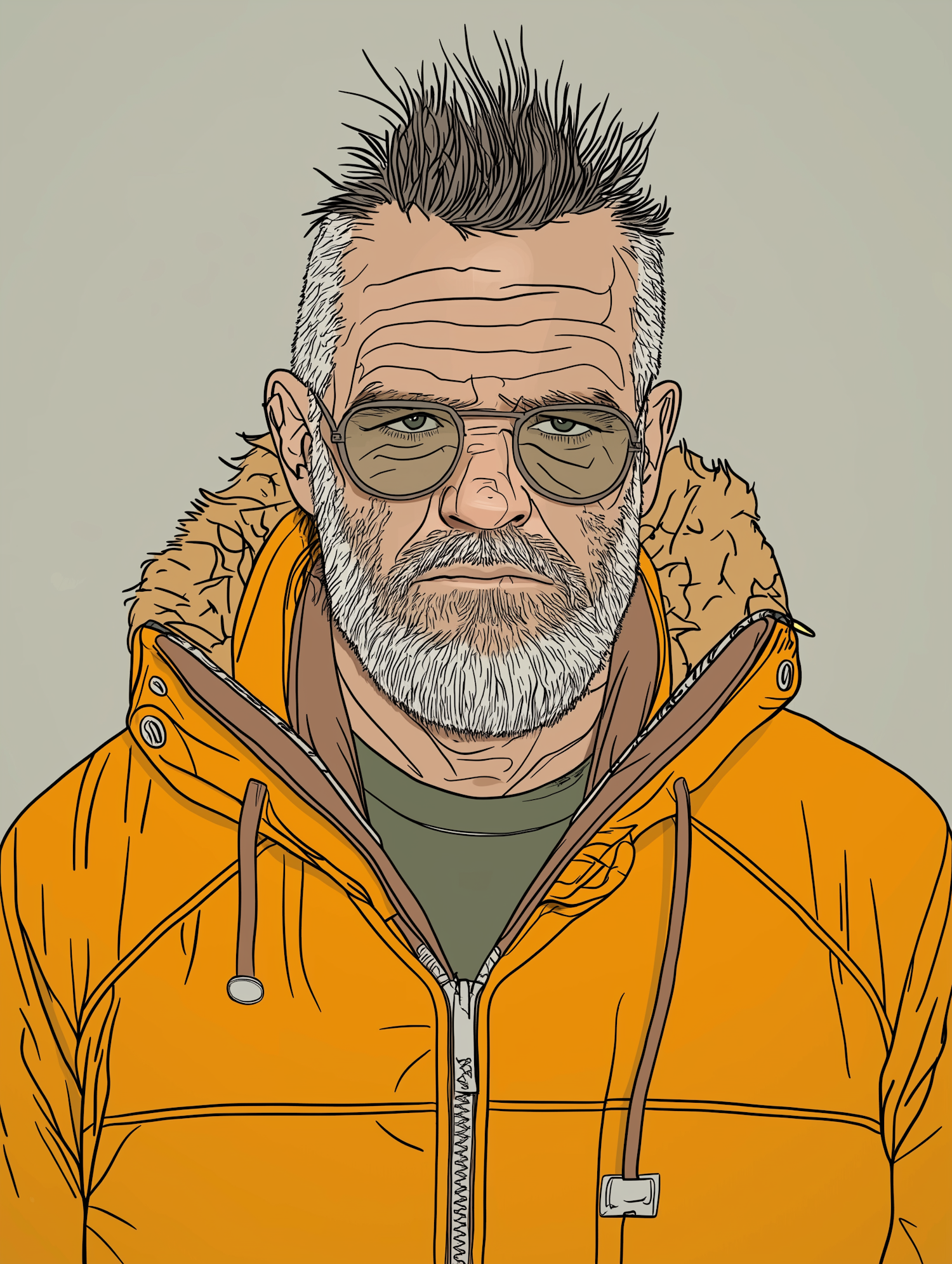 Illustration of a rugged man with spiky hair, glasses, and an orange winter jacket with a fur-lined hood.