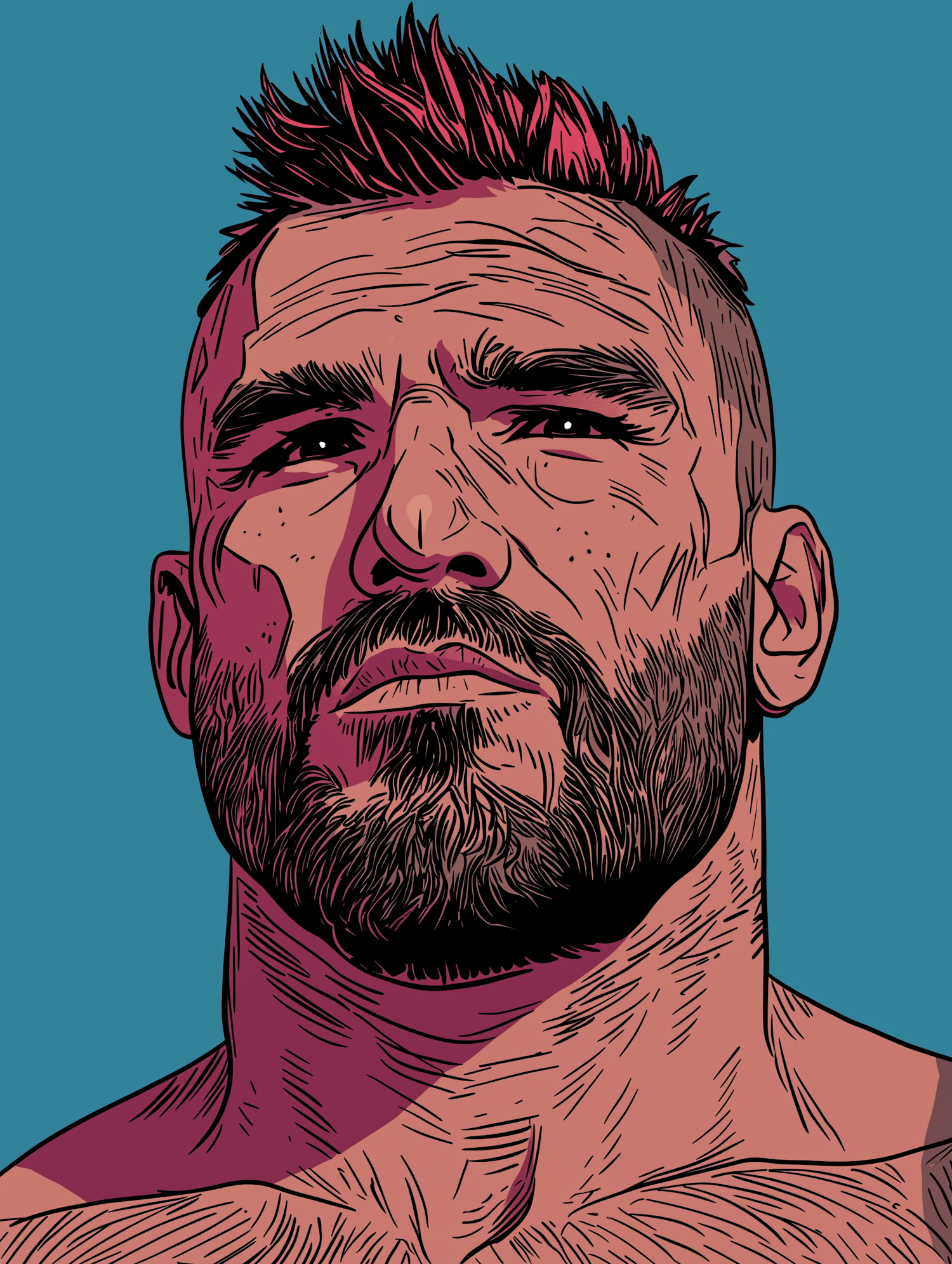 Bold illustration of a rugged man with a beard, spiked hair, and intense expression against a teal background. Striking and detailed art.