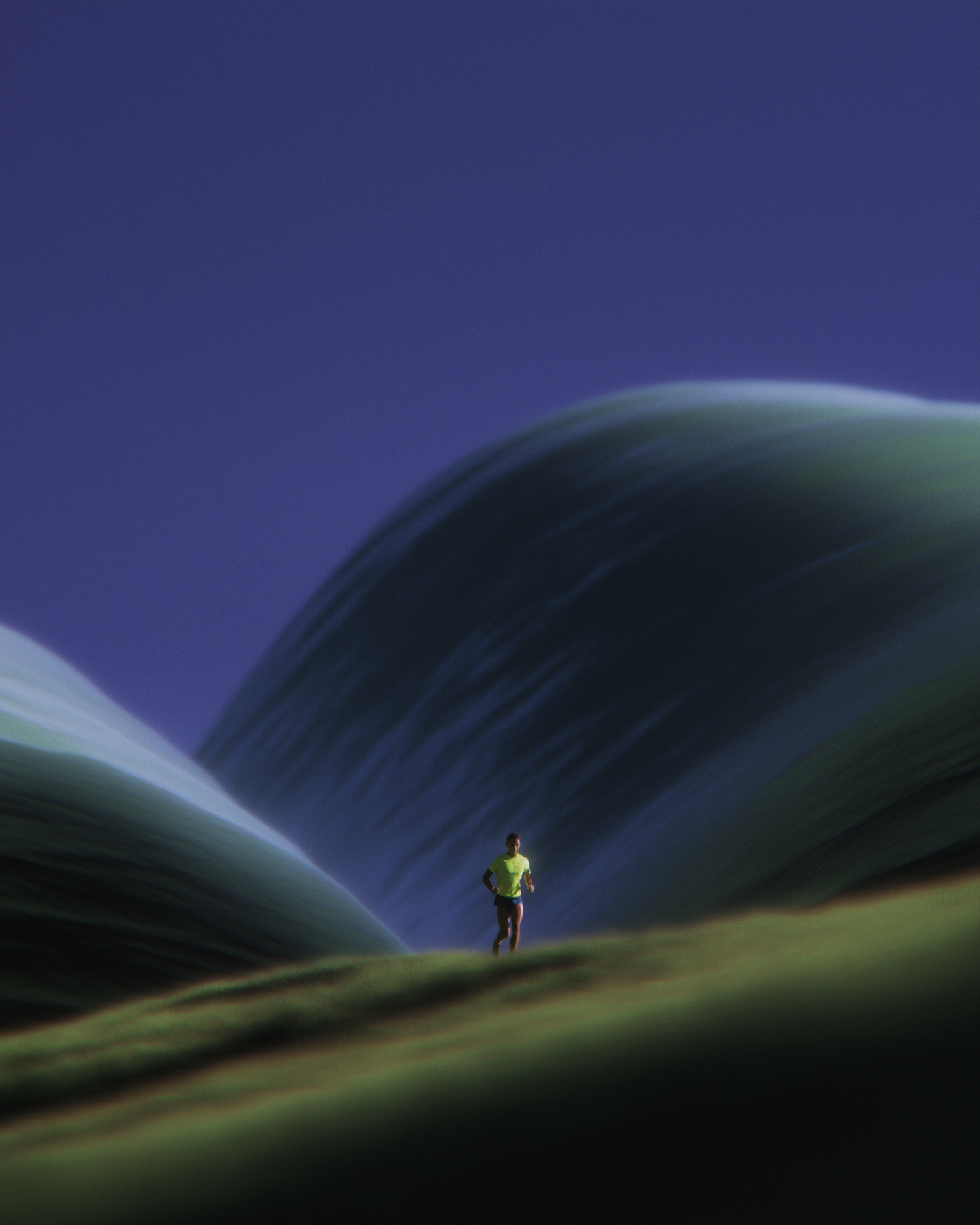 A runner in a bright yellow shirt moves through surreal green hills under a deep blue sky, creating a striking and dreamlike scene.