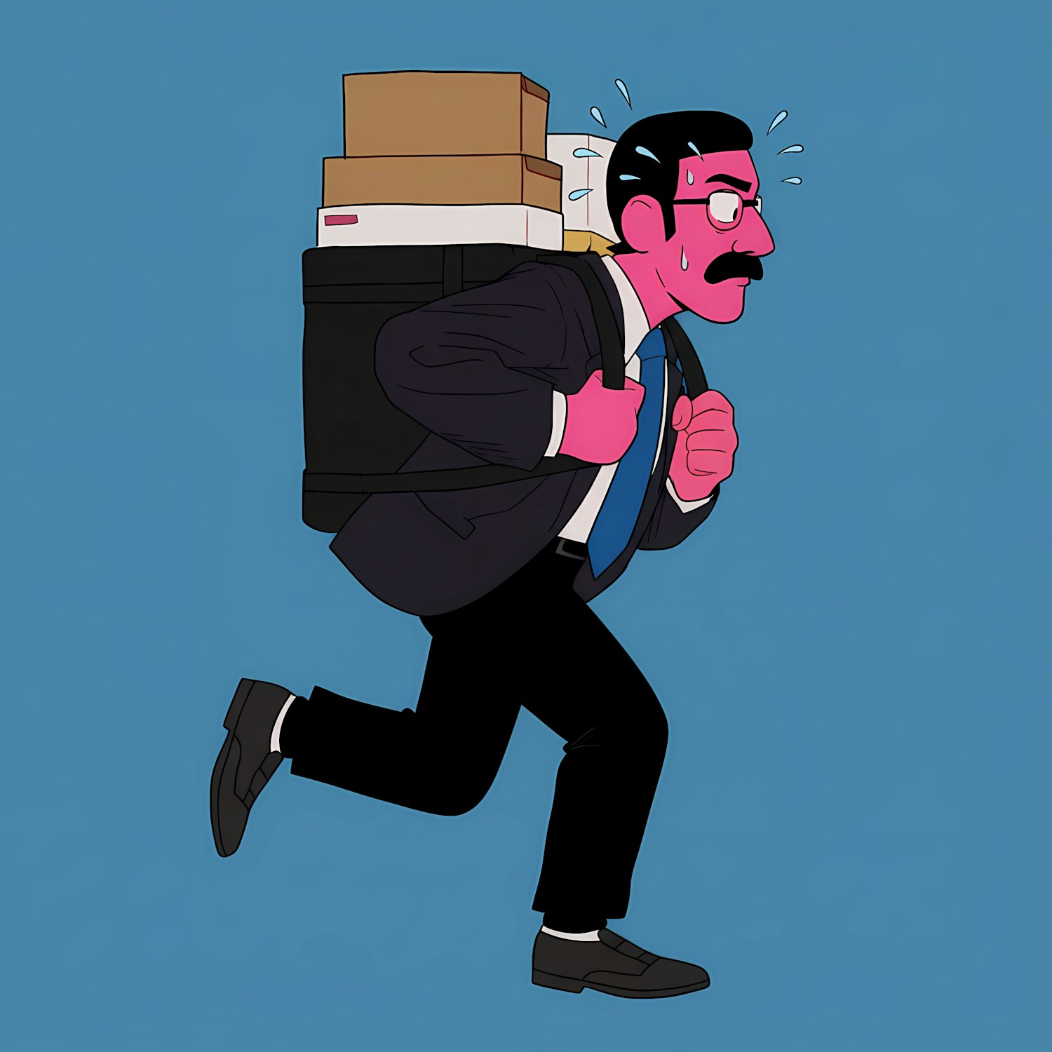 Cartoon of a man in a suit running with a heavy backpack of boxes, sweating and showing urgency against a solid blue background.