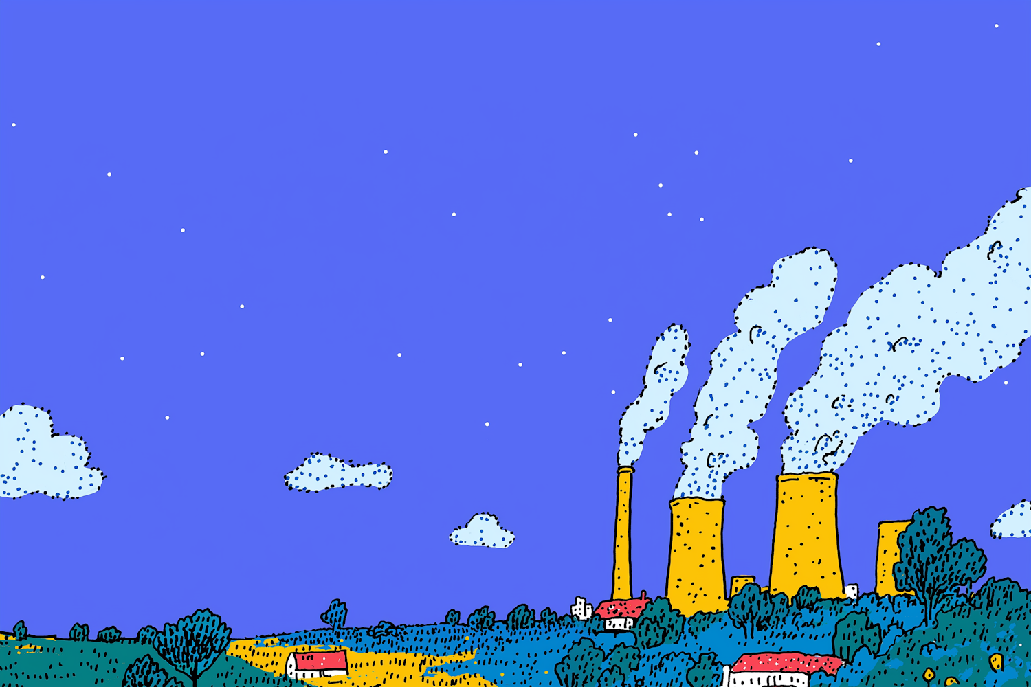 A vibrant illustration of a rural landscape with a factory emitting smoke, surrounded by fields, houses, and a clear blue sky.