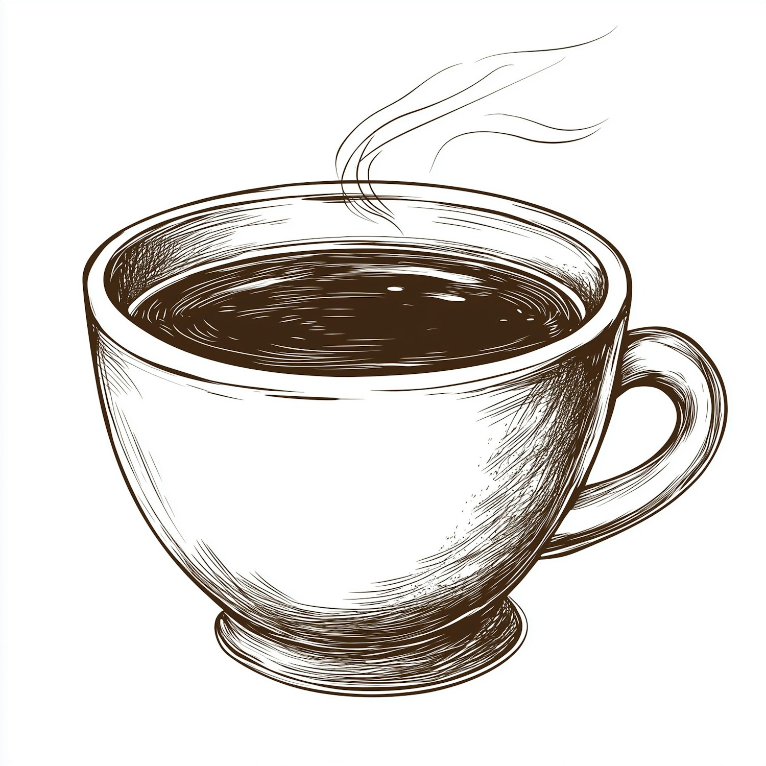 Rustic hand-drawn illustration of a steaming coffee cup with intricate linework and a cozy, inviting vibe. Perfect for coffee lovers!