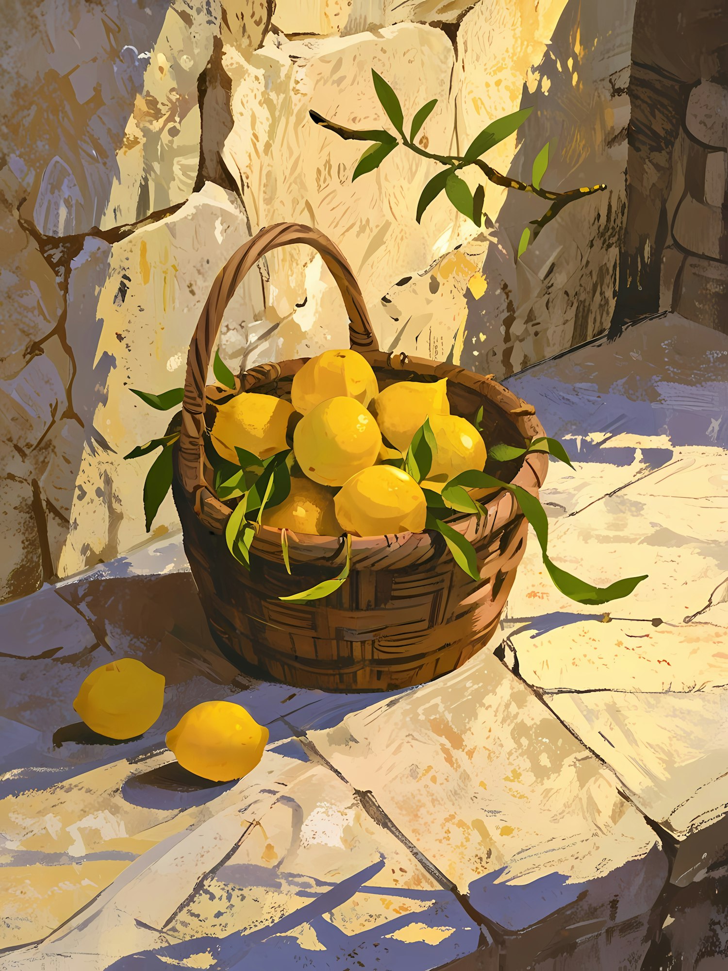 Rustic basket of ripe yellow lemons on sunlit stone, evoking Mediterranean charm with warm hues and natural textures.