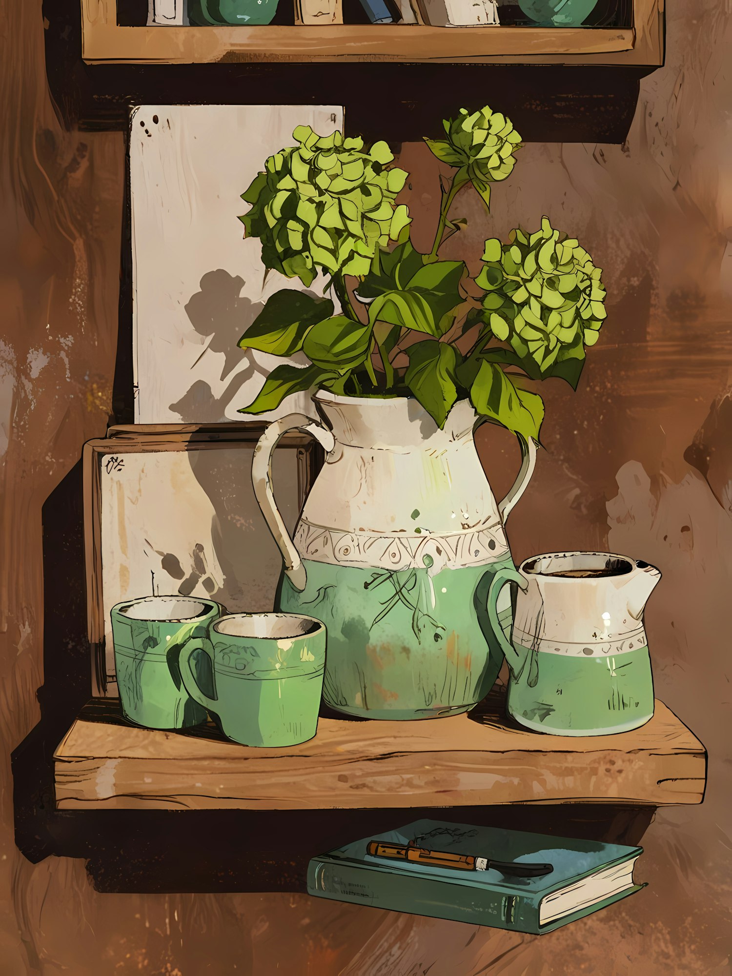 Illustration of a rustic shelf with a floral ceramic pitcher, hydrangeas, and books creating a cozy, vintage ambiance.