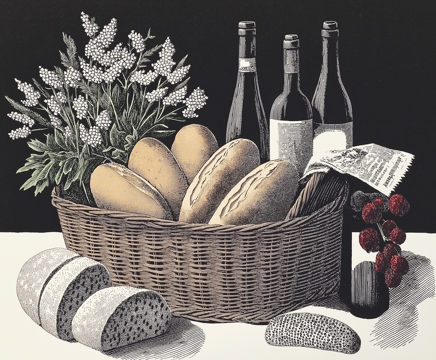 Rustic still life illustration with bread, wine, flowers, and berries in a wicker basket against a black background.