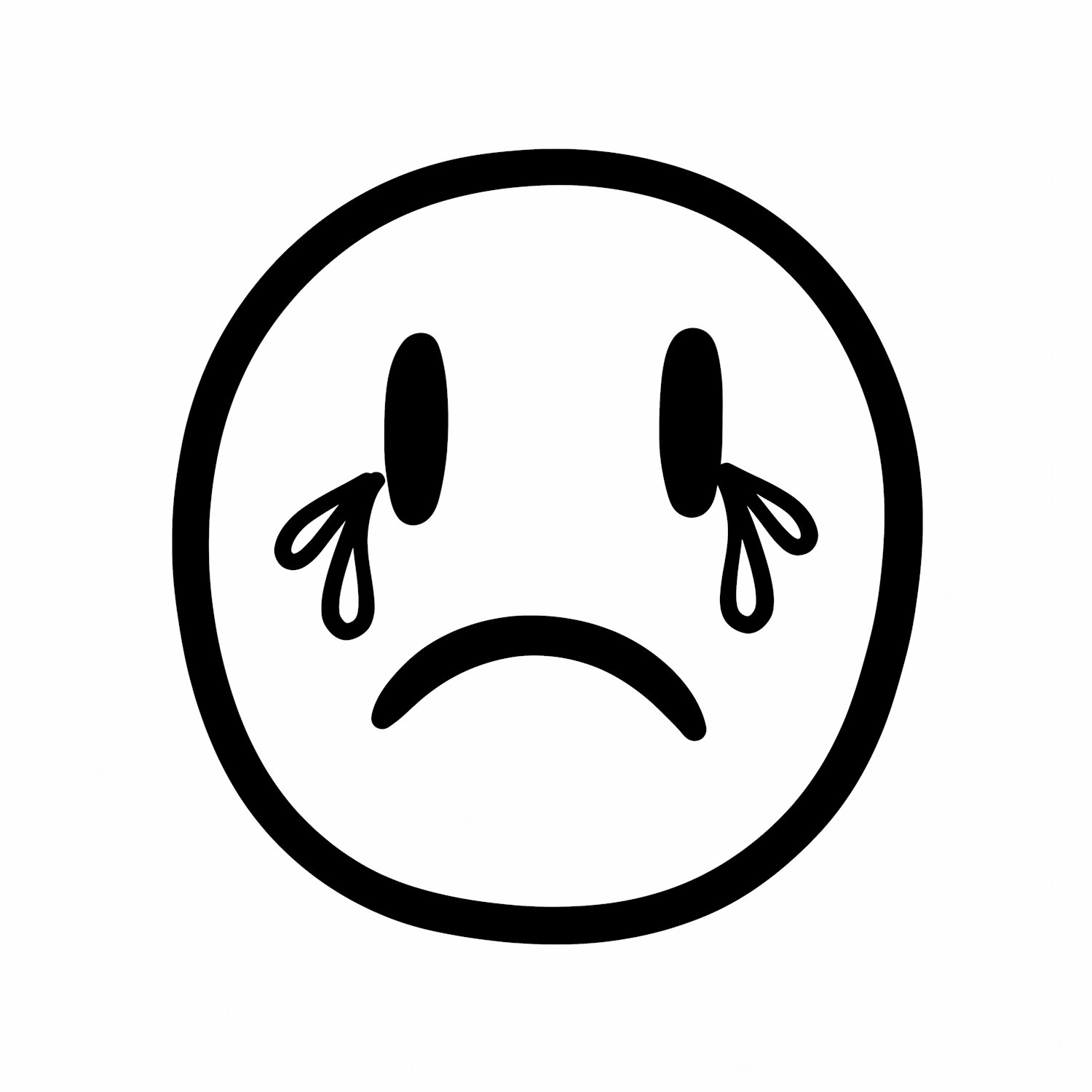 A minimalist black-and-white sad face emoji with teardrops, expressing sadness in a simple and bold design.