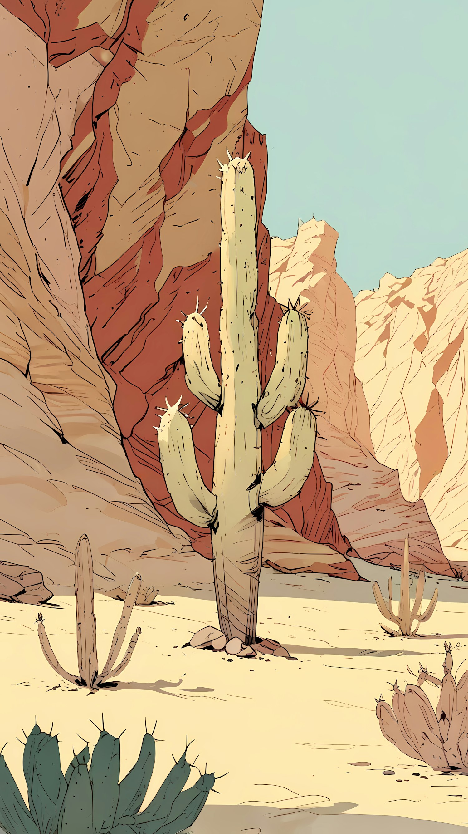 Illustration of a vibrant desert scene with a tall cactus, rocky cliffs, and sandy ground, highlighting the arid beauty of the landscape.