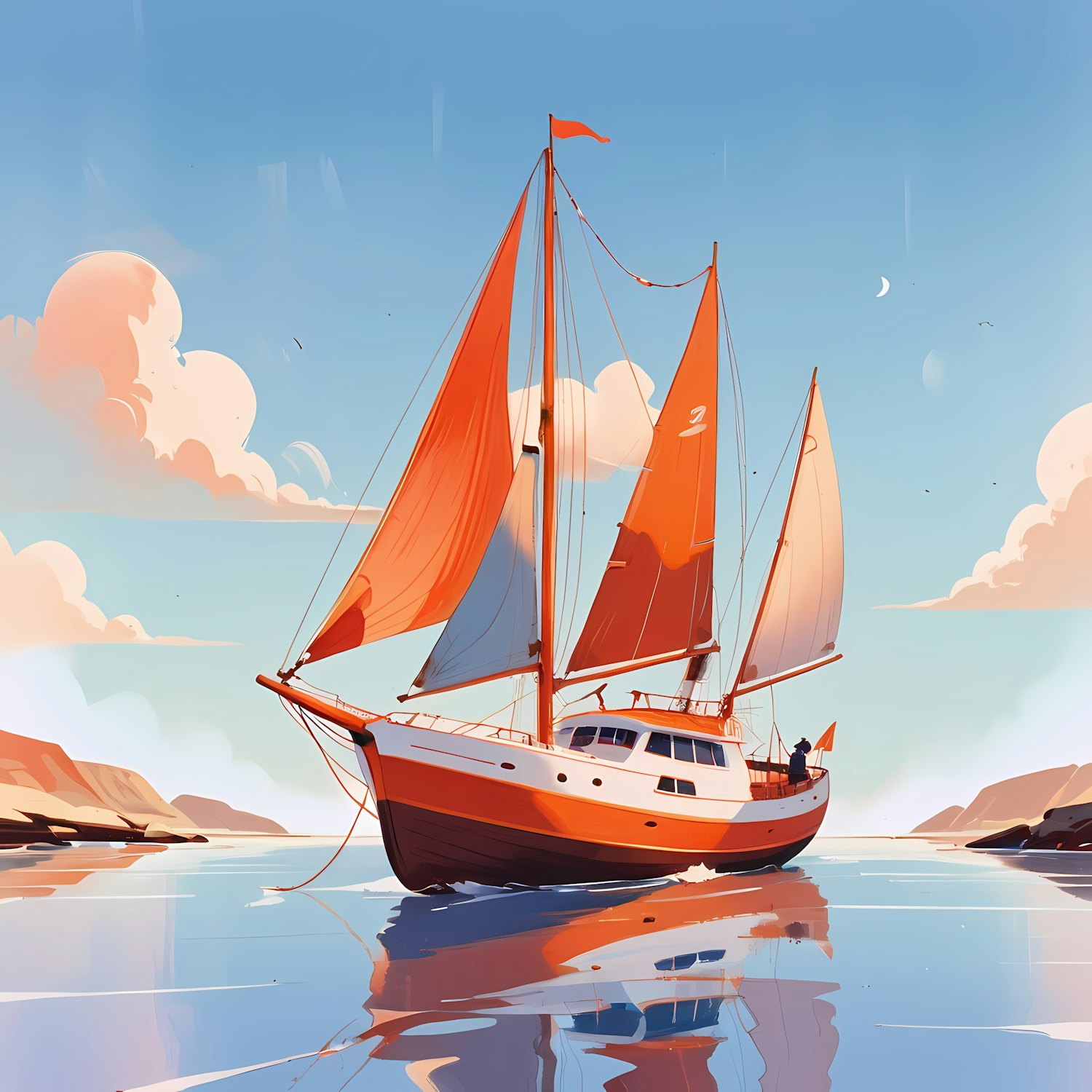 A stunning illustration of a red and white sailboat on calm waters, with a clear blue sky and serene reflections. Perfect for nautical vibes.
