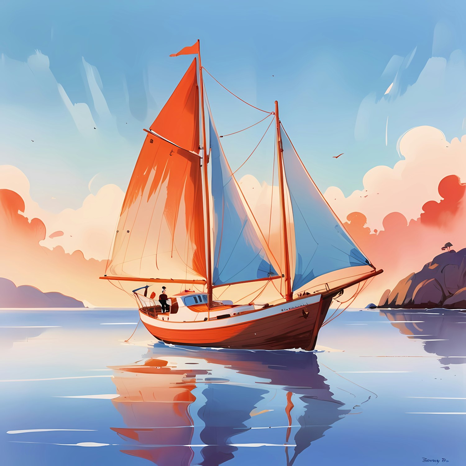 A colorful sailboat with red and blue sails on calm waters during sunset, with a serene sky and rocky shoreline in the background.