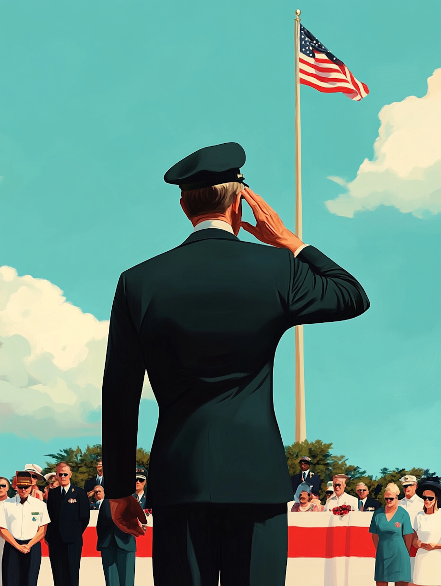 A military officer salutes the American flag during a patriotic ceremony, with a crowd gathered in the background.