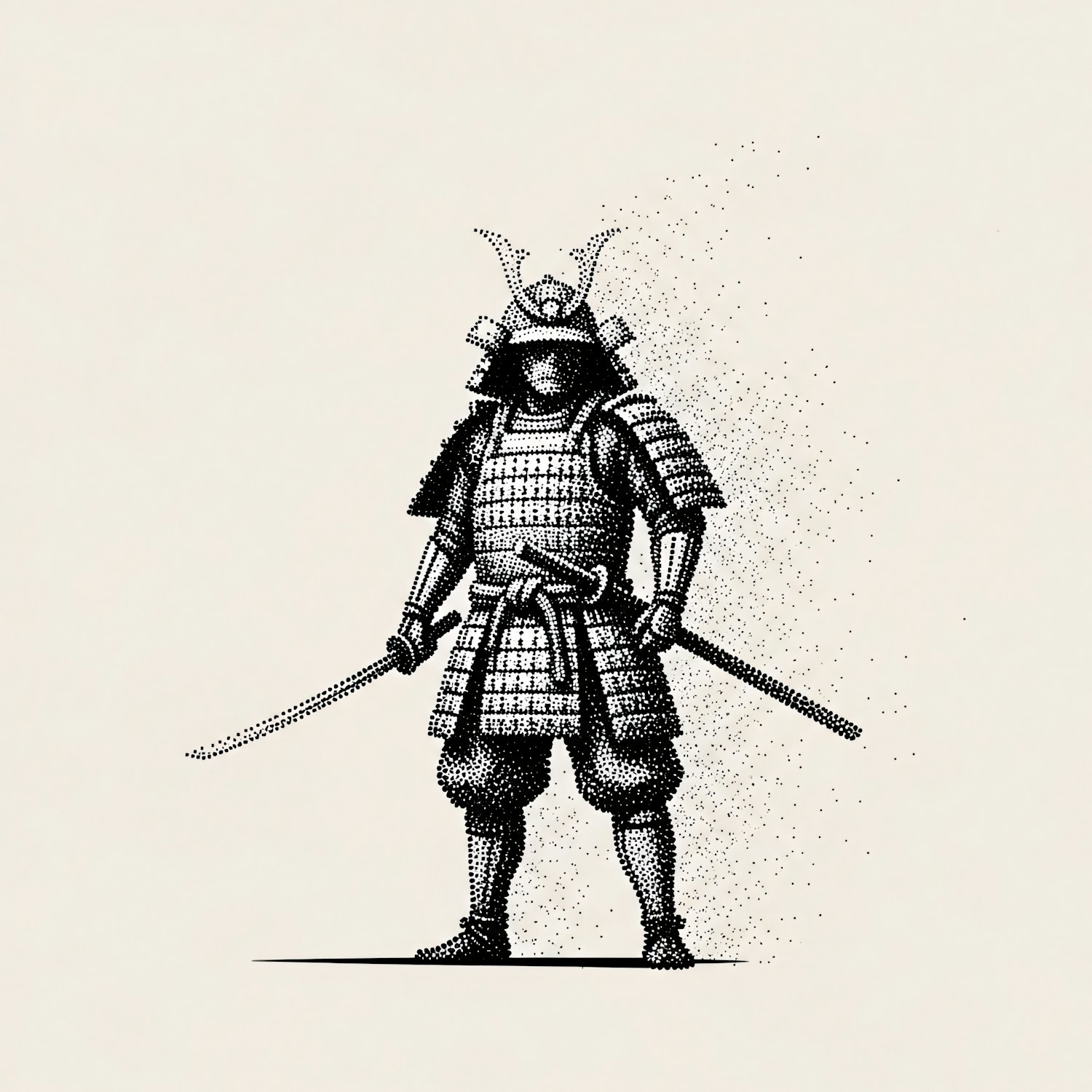 A stippled illustration of a samurai in traditional armor, holding a katana, with intricate details and a minimalist background.