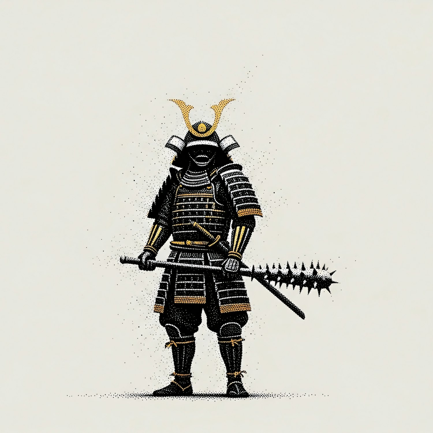 Stylized stippling illustration of a samurai in black and gold armor holding a spiked weapon, showcasing intricate details and cultural artistry.