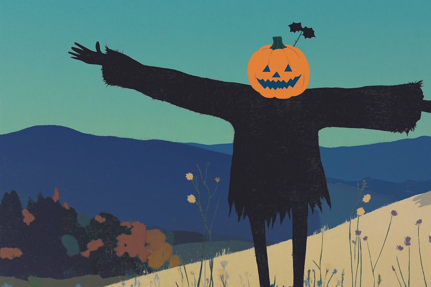 Charming illustration of a scarecrow with a pumpkin head in a scenic autumn landscape, featuring rolling hills and wildflowers.