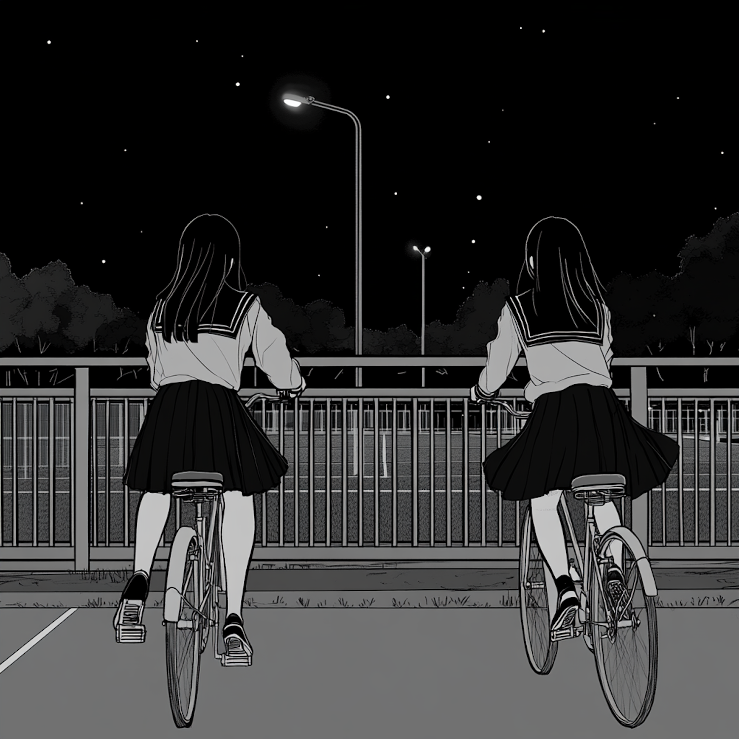 Two girls in school uniforms on bicycles gaze at a starry night sky near a railing, creating a serene and contemplative scene.