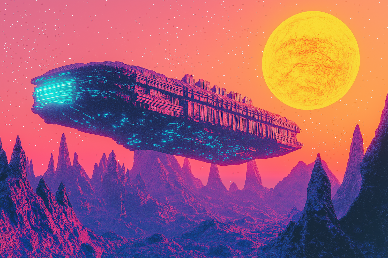 Futuristic spaceship hovers over a vibrant alien landscape with a glowing sun and jagged mountains.