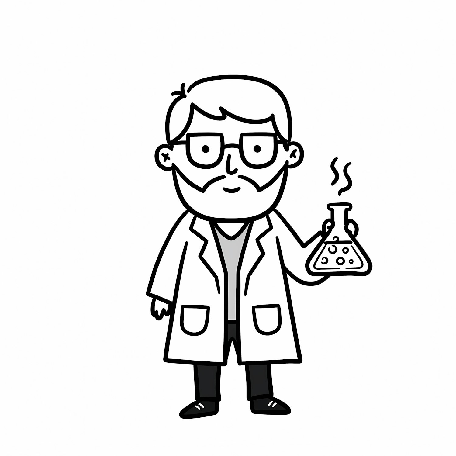 Cartoon scientist holding a bubbling flask, drawn in a clean black-and-white style, perfect for educational or science-themed content.
