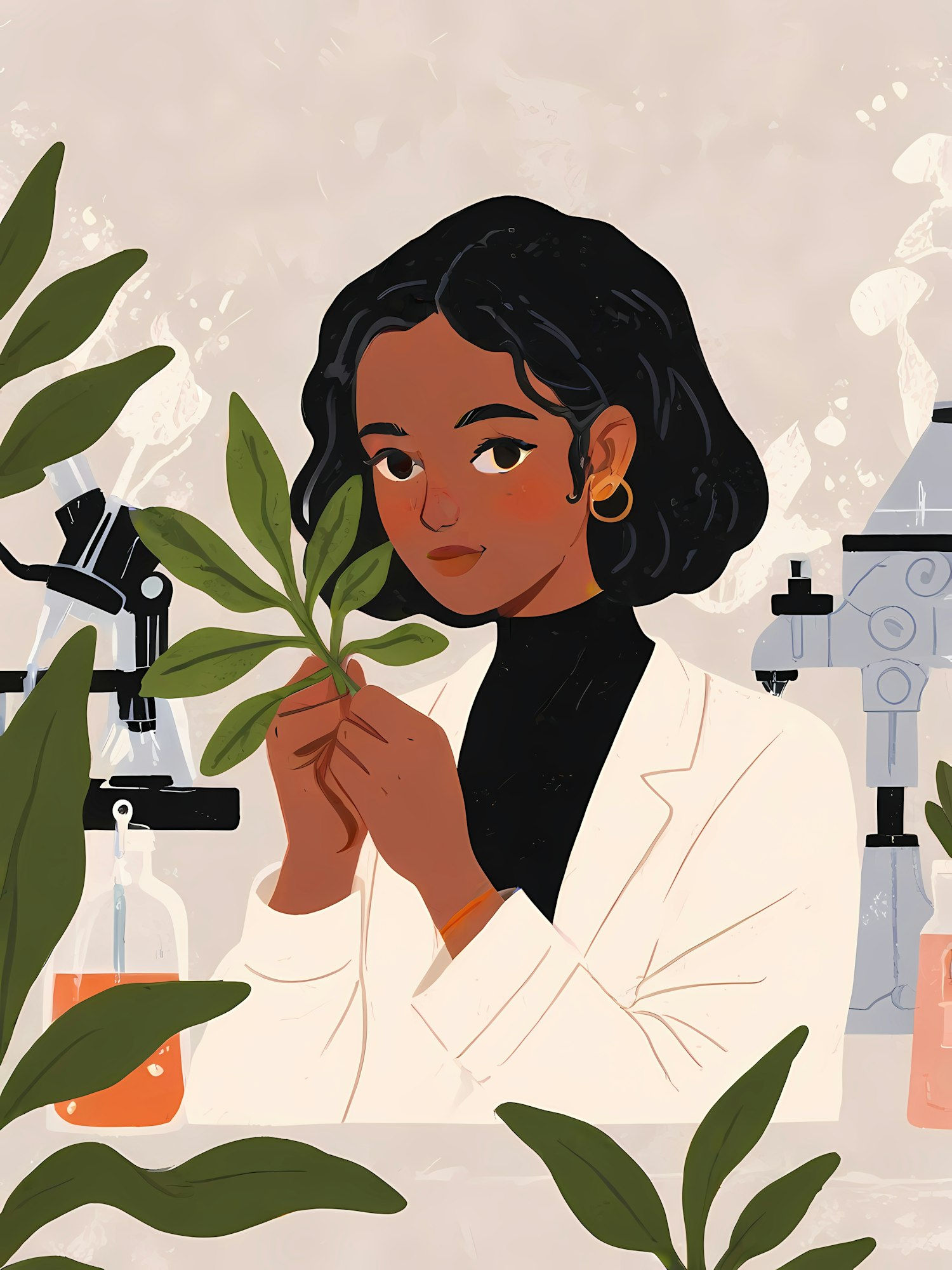 Illustration of a scientist examining a plant in a lab, surrounded by equipment like a microscope and beakers. Perfect for science themes.