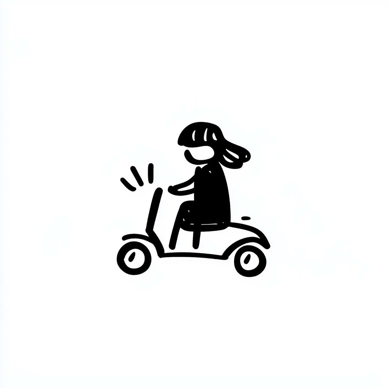 Minimalist black-and-white illustration of a person riding a scooter, with flowing hair and motion lines for a playful, dynamic vibe.