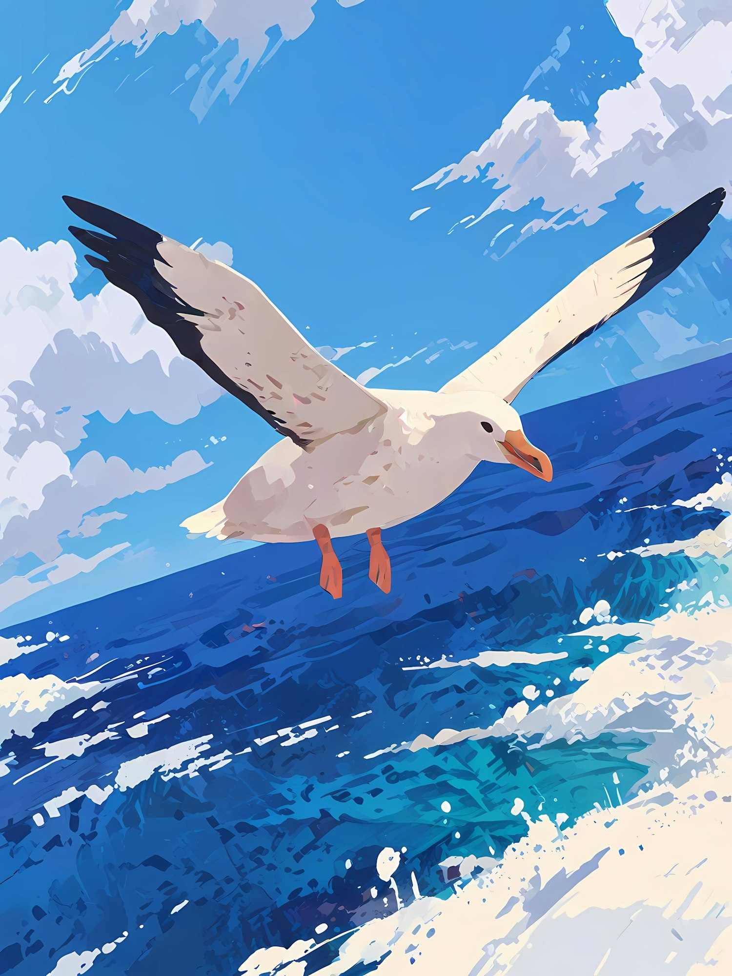 A stunning illustration of a seagull flying over a vibrant ocean with splashing waves and a bright blue sky.
