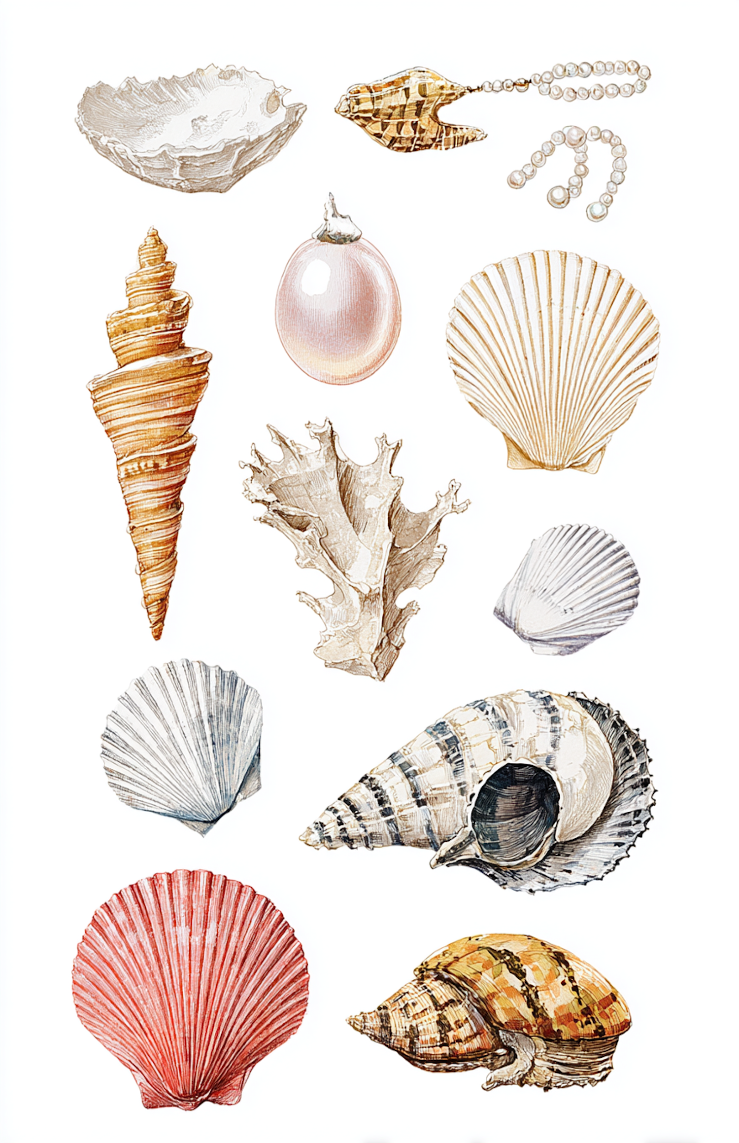 Illustration of detailed seashells, coral, and pearls on a white background, depicting natural patterns and textures beautifully.