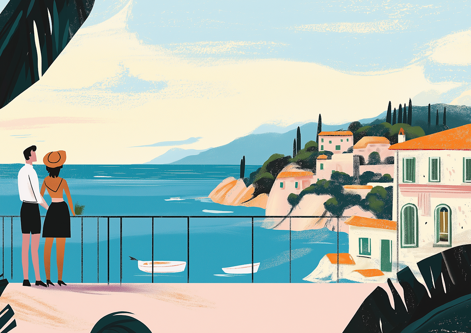 Illustration of a couple enjoying a scenic coastal view with boats and a charming village in the background.
