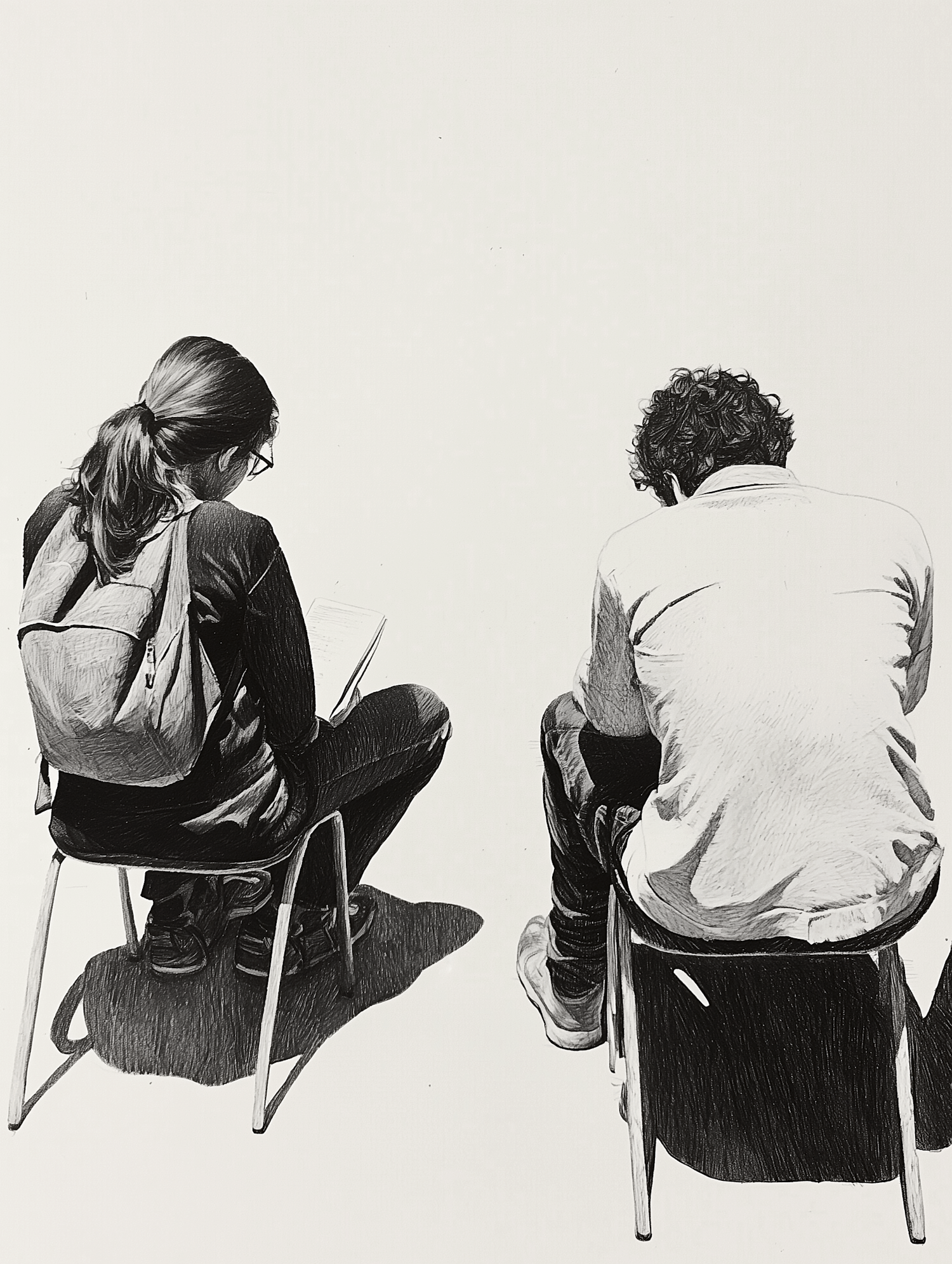 Two people sitting on chairs, viewed from behind, one reading or writing. Minimalist black and white illustration.