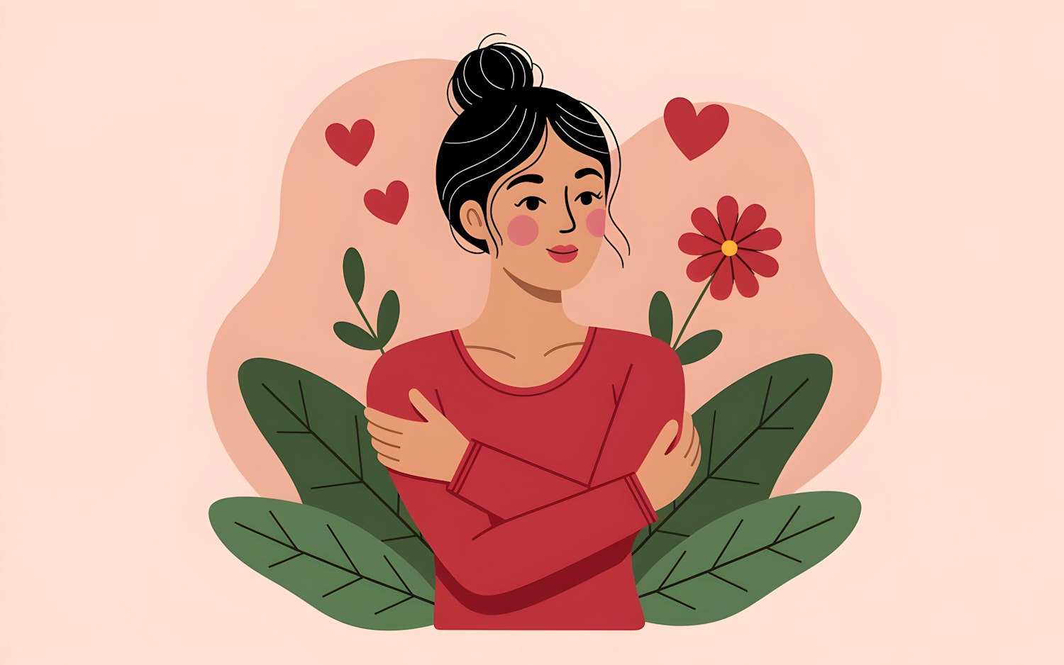 Illustration of a woman embracing herself with hearts, leaves, and flowers, symbolizing self-love and positivity in a warm peach background.