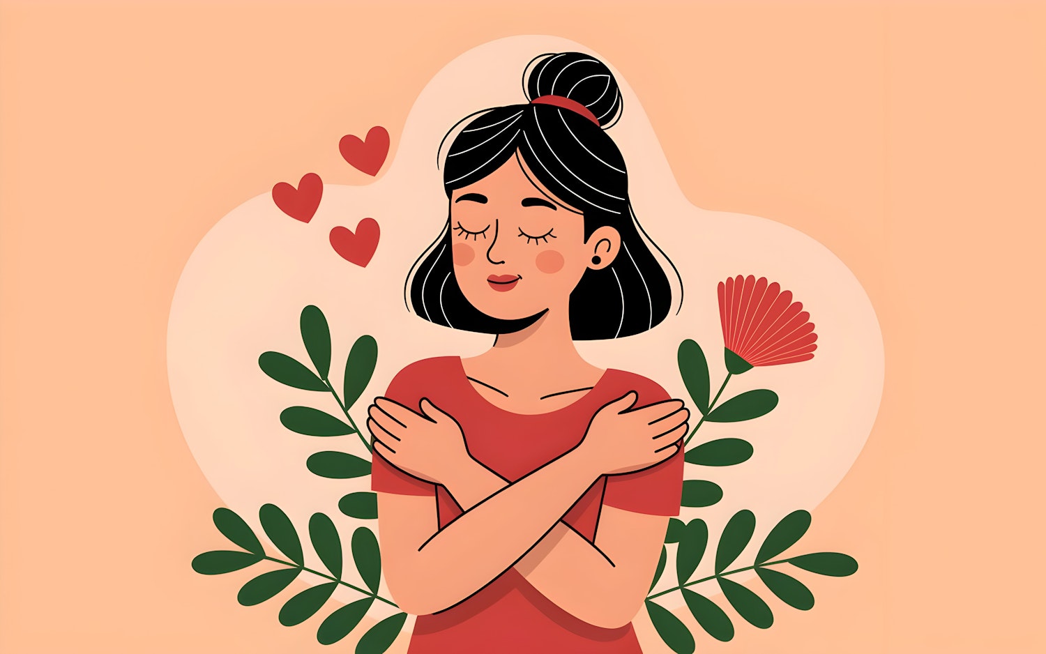 Illustration of a serene woman hugging herself, surrounded by leaves, a flower, and hearts, symbolizing self-love and positivity.