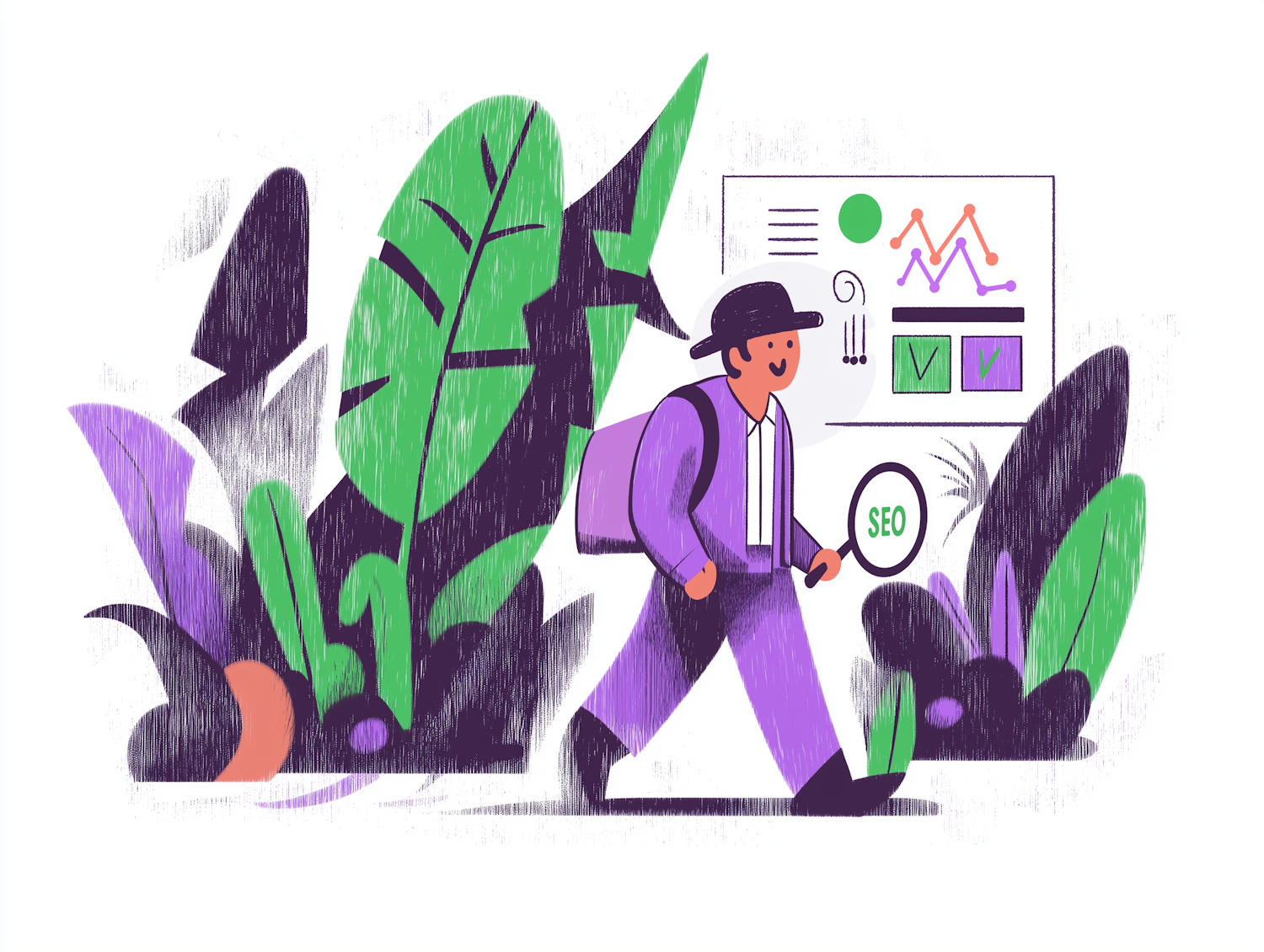 Whimsical illustration of a person exploring SEO concepts in a jungle setting with charts and vibrant colors.