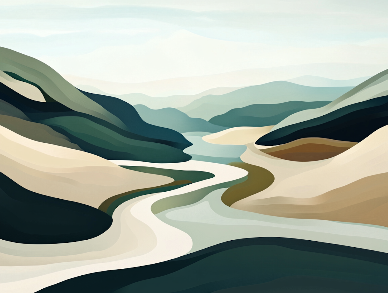 Abstract landscape art with a winding river, rolling hills in green and beige tones, and a soft, muted blue sky. Minimalist and calming.