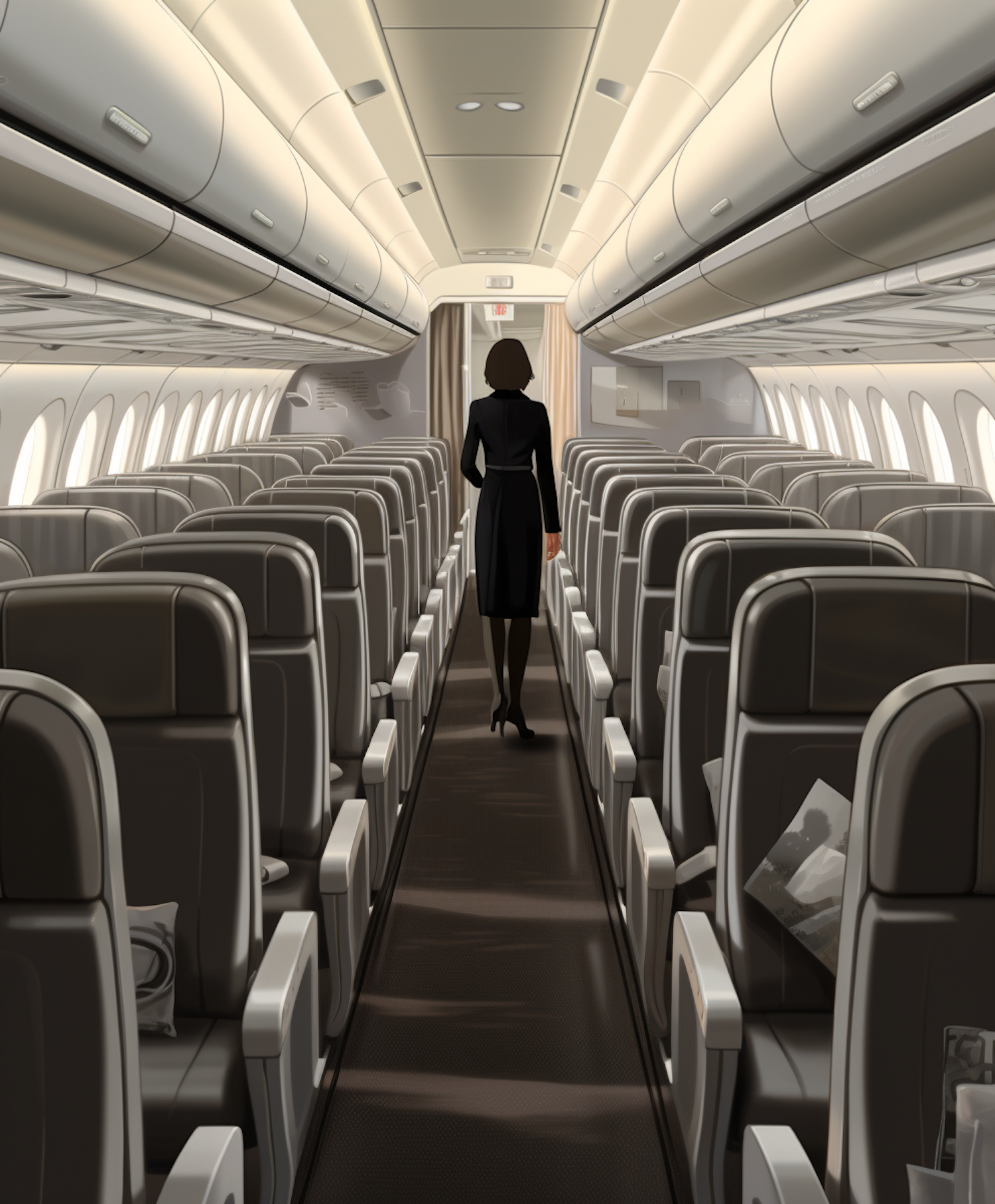 Serene Aisle of the Unoccupied Airplane Cabin with Silhouetted Flight Attendant