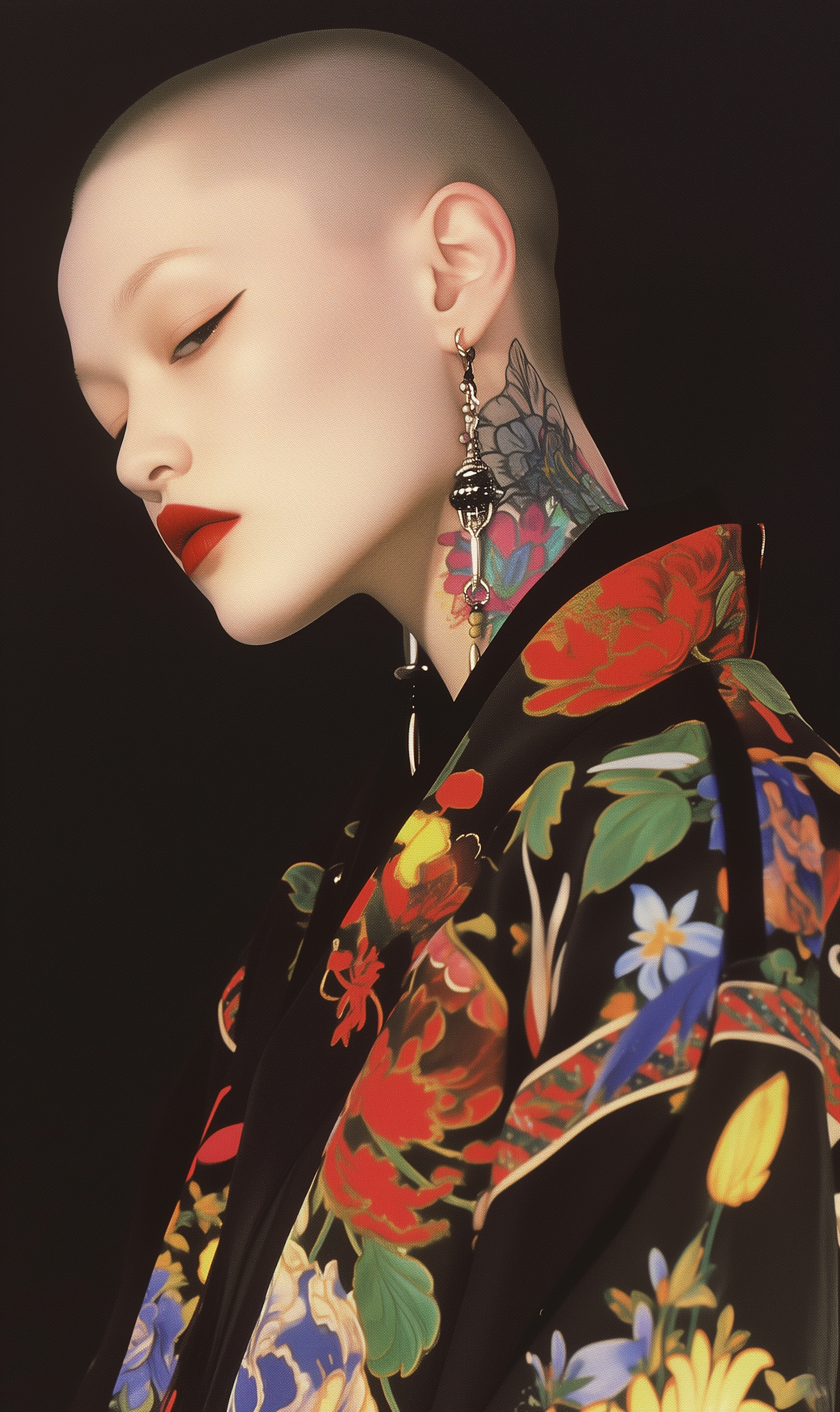 Bald Asian woman with floral tattoo and bold earring, wearing a vibrant floral-patterned garment against a black background.