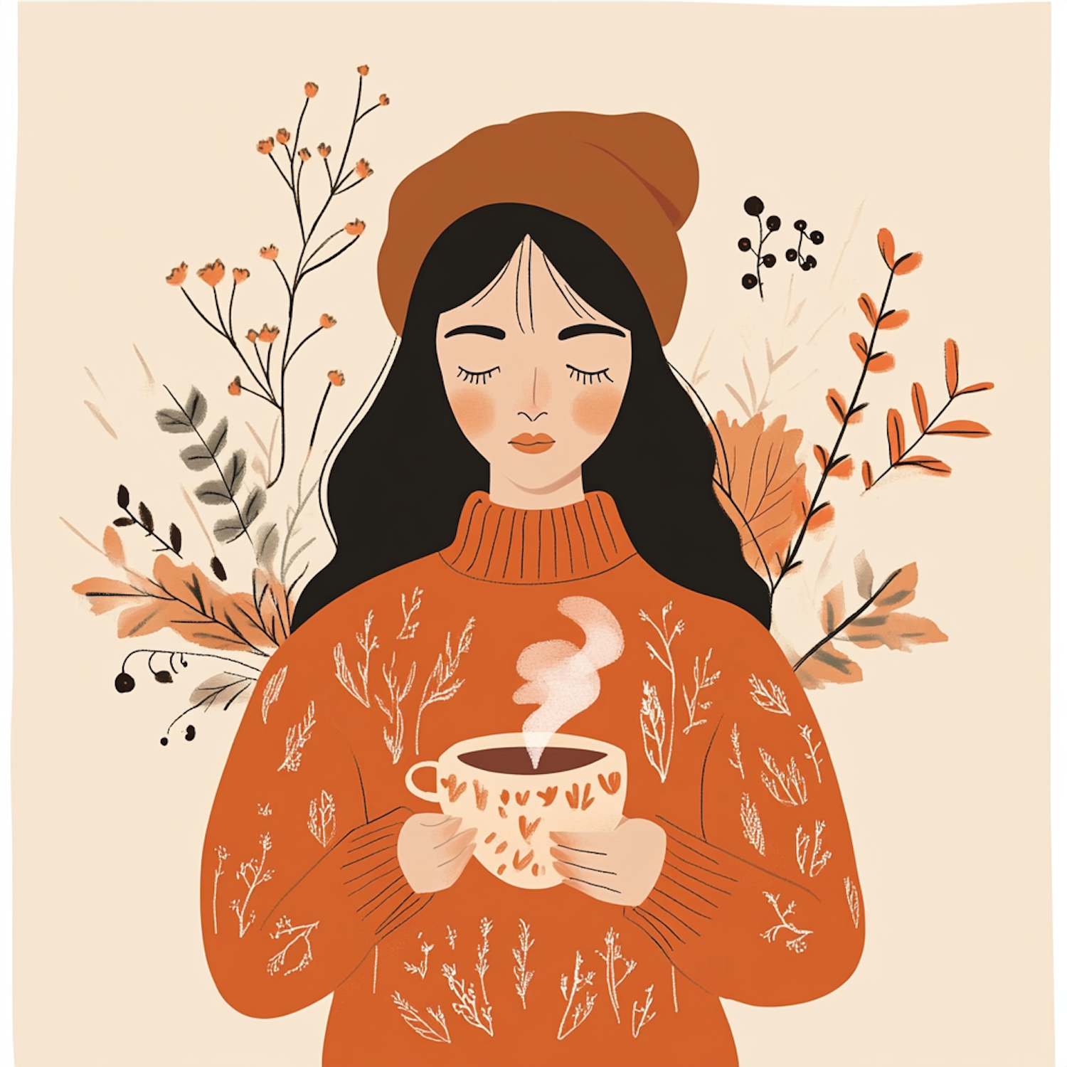 Illustration of a woman in an orange sweater and beanie, holding a steaming cup, surrounded by autumn leaves on a beige background.