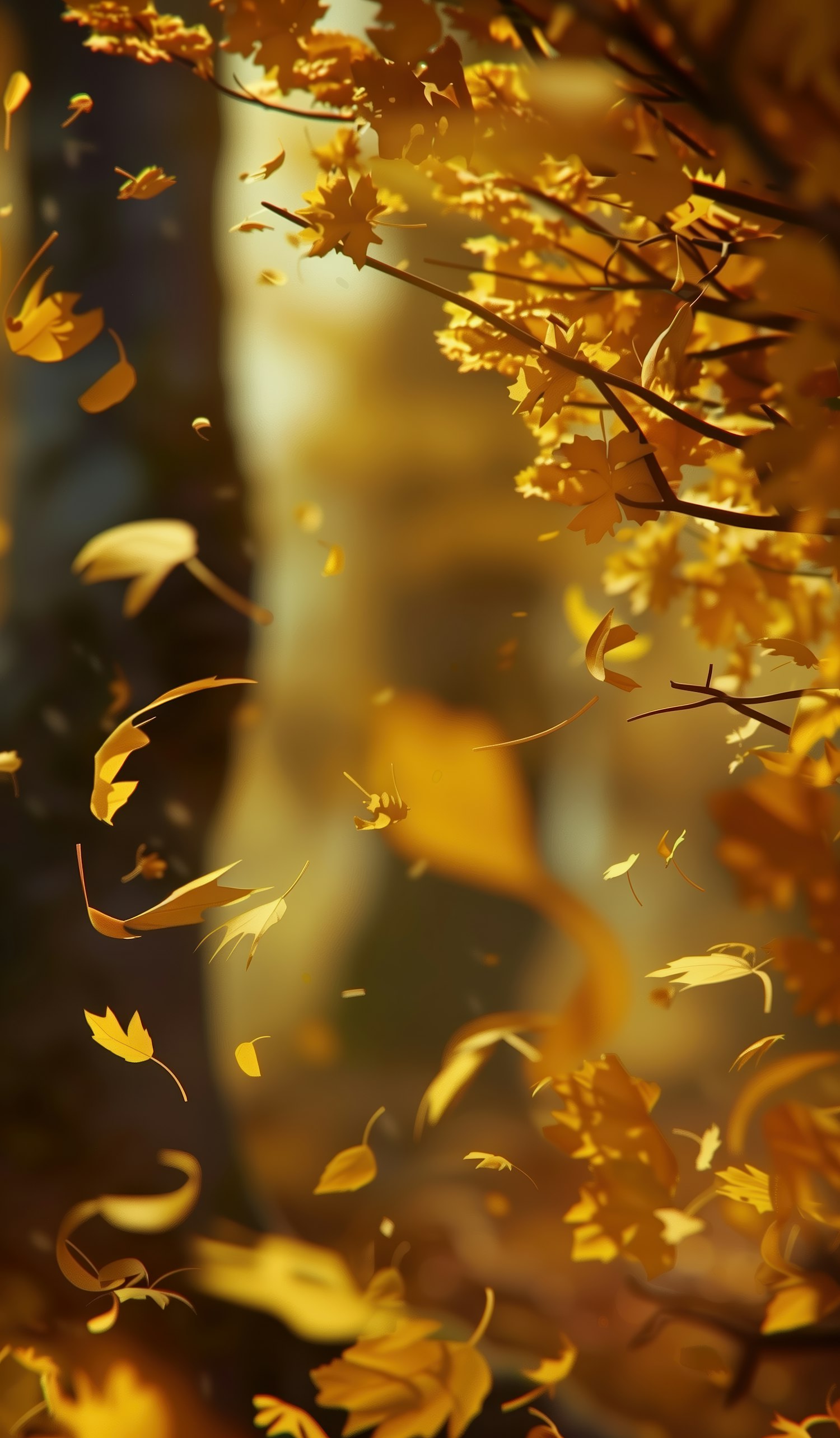 Golden autumn leaves swirl in a gentle breeze, creating a warm and vibrant fall scene with dynamic movement and rich colors.