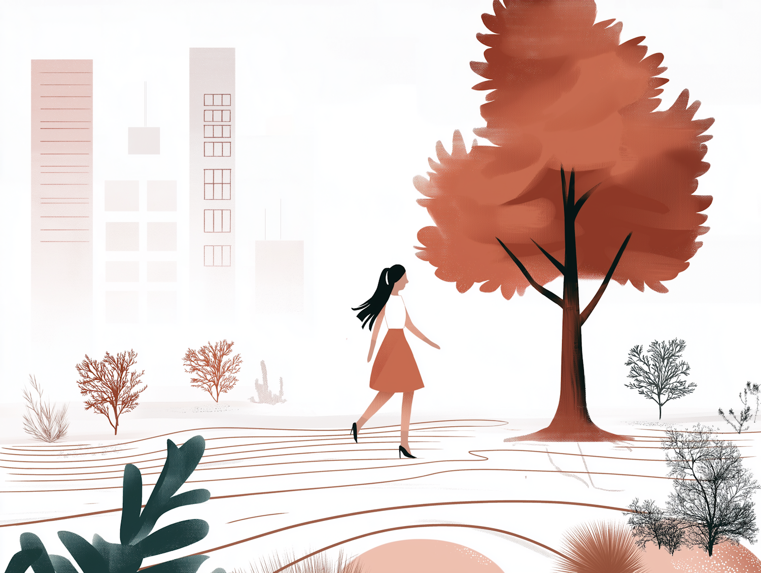 Illustration of a woman walking towards a large tree in a park, with city buildings in the background. Warm autumnal colors dominate the scene.