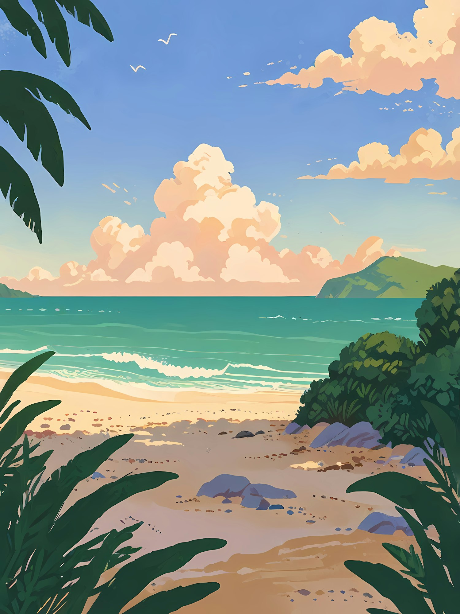Tranquil beach scene with turquoise waves, peach clouds, and lush greenery. Perfect for a serene coastal escape.