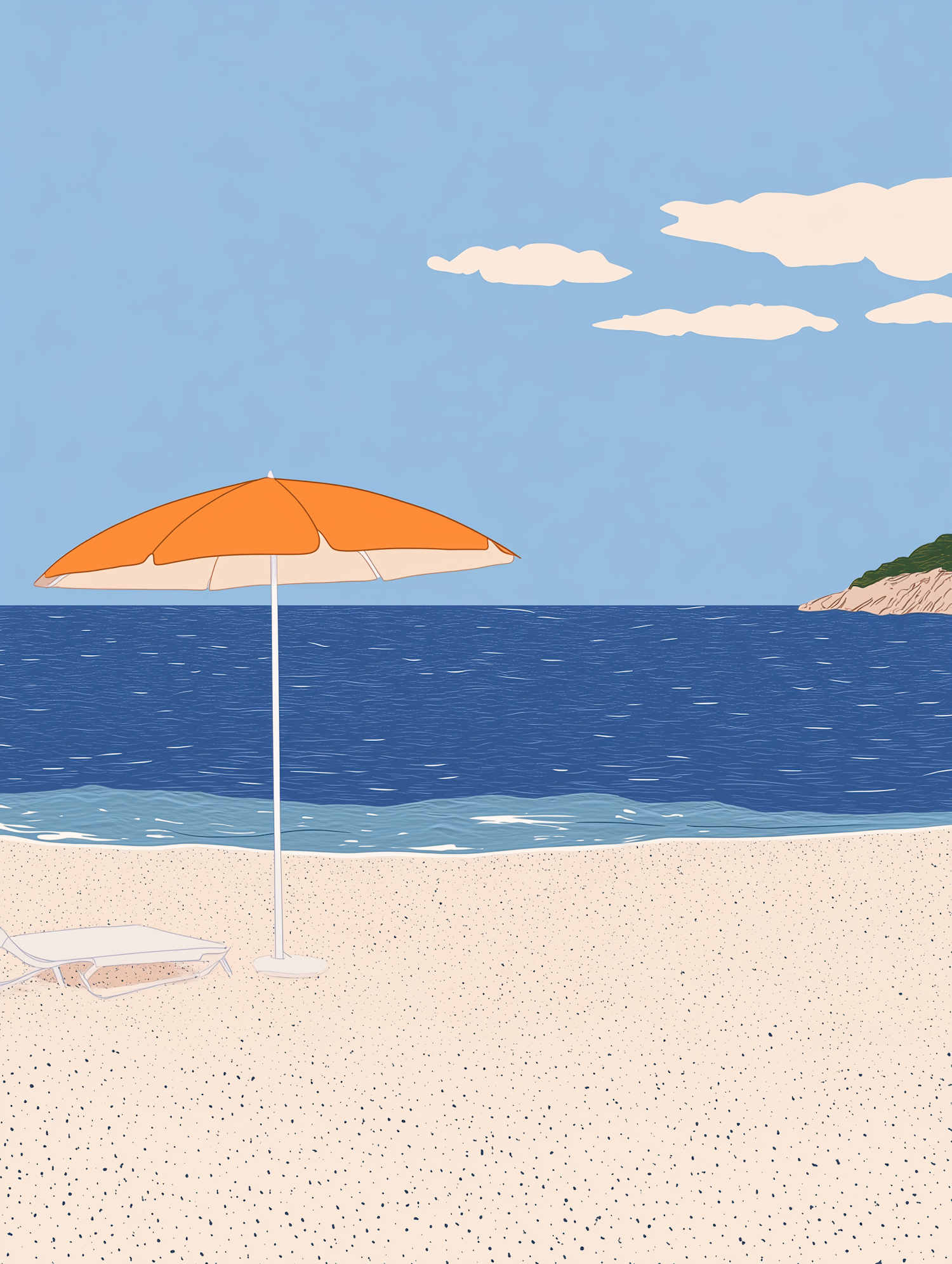 Illustration of a tranquil beach with an orange umbrella, blue sea, and a distant hill under a clear sky.