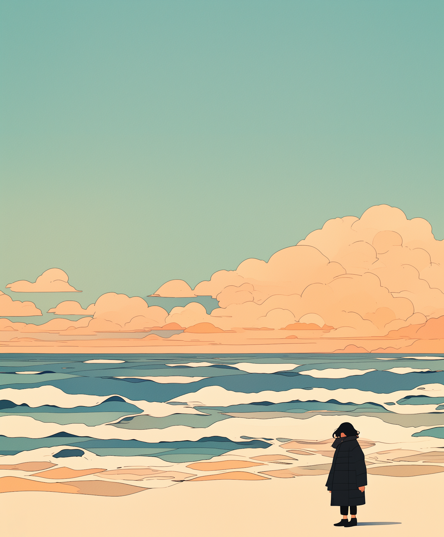 A solitary figure in a dark coat stands on a tranquil beach, with pastel skies and gentle waves creating a serene atmosphere.