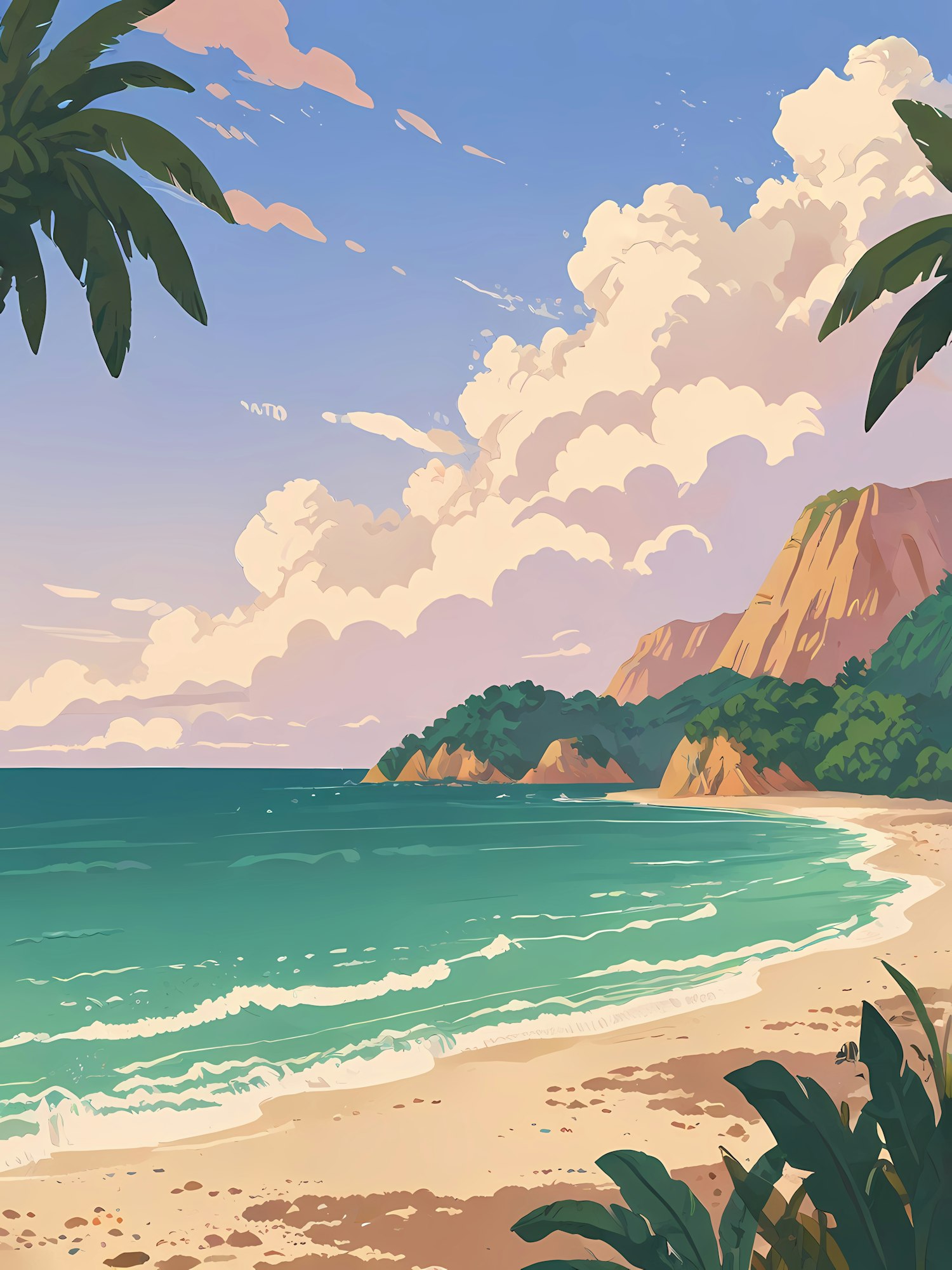 Tranquil beach scene with turquoise waters, palm trees, and a rocky cliff under a pastel sky. Perfect for a tropical escape.
