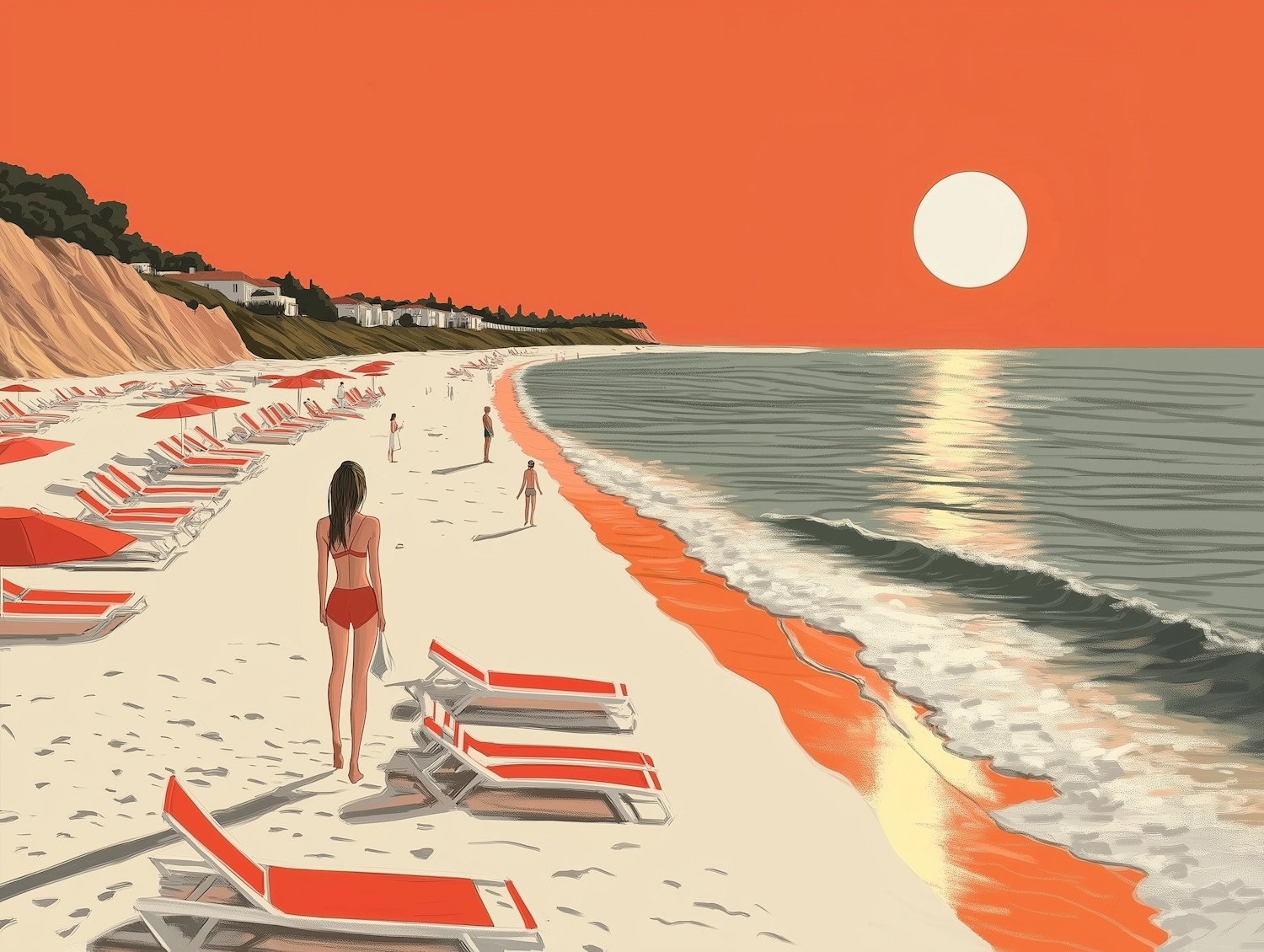 Vibrant beach scene with orange sky, setting sun, and red-striped loungers. A woman in a red bikini walks along the serene shore.