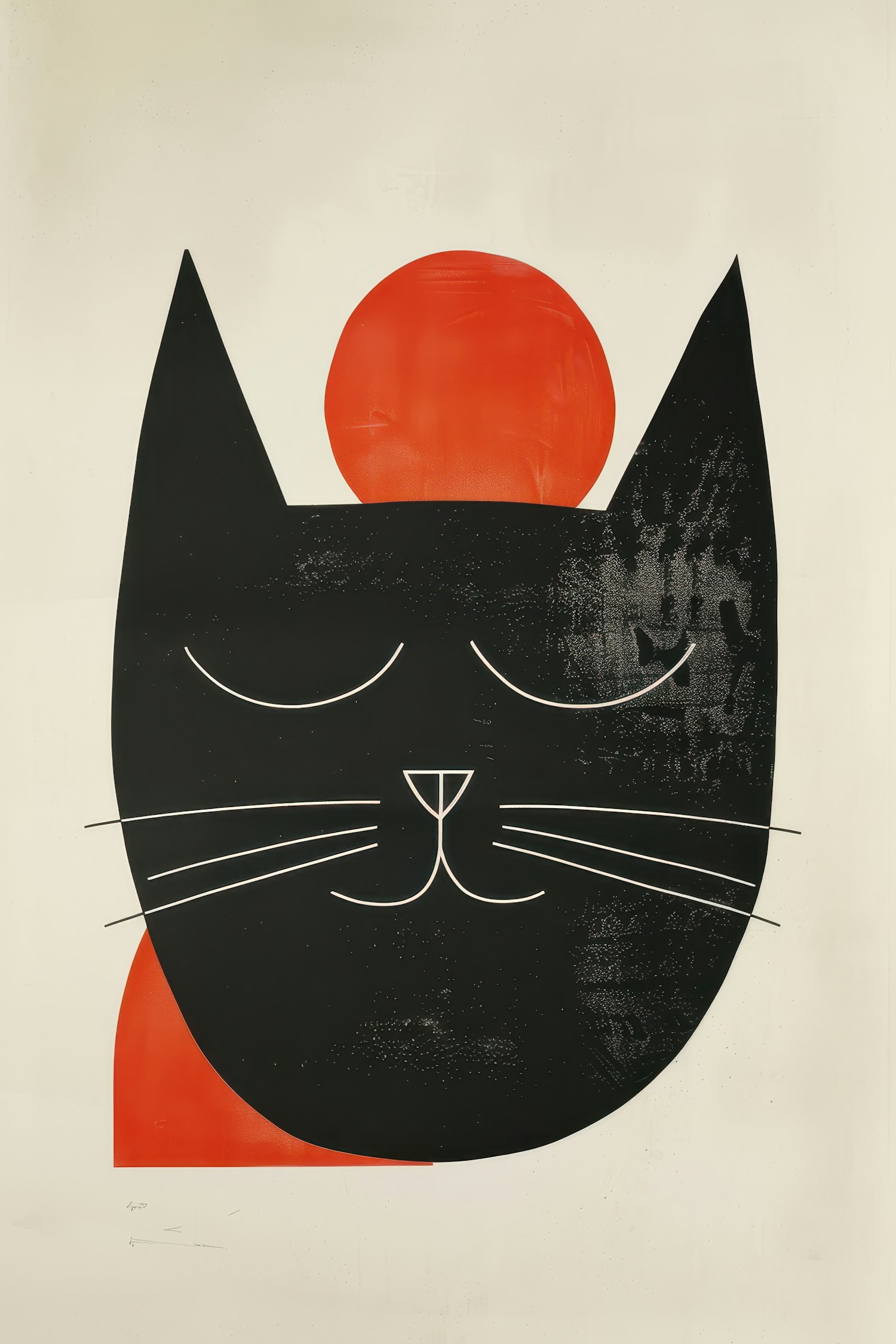 Minimalist illustration of a black cat with closed eyes and a red circle, set against an off-white background.