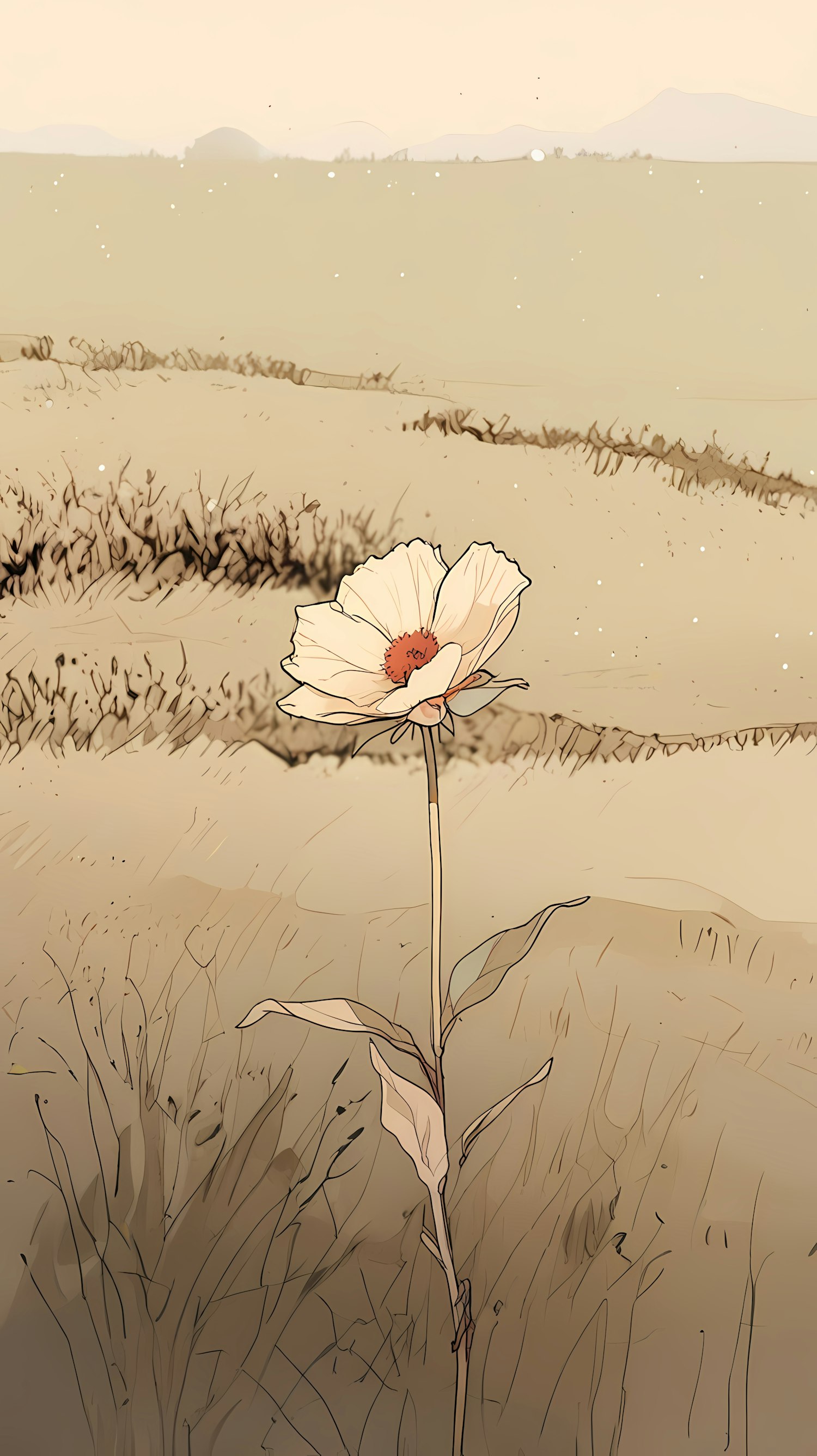 A delicate white flower with an orange center stands tall in an expansive, softly shaded field with rolling hills beyond.
