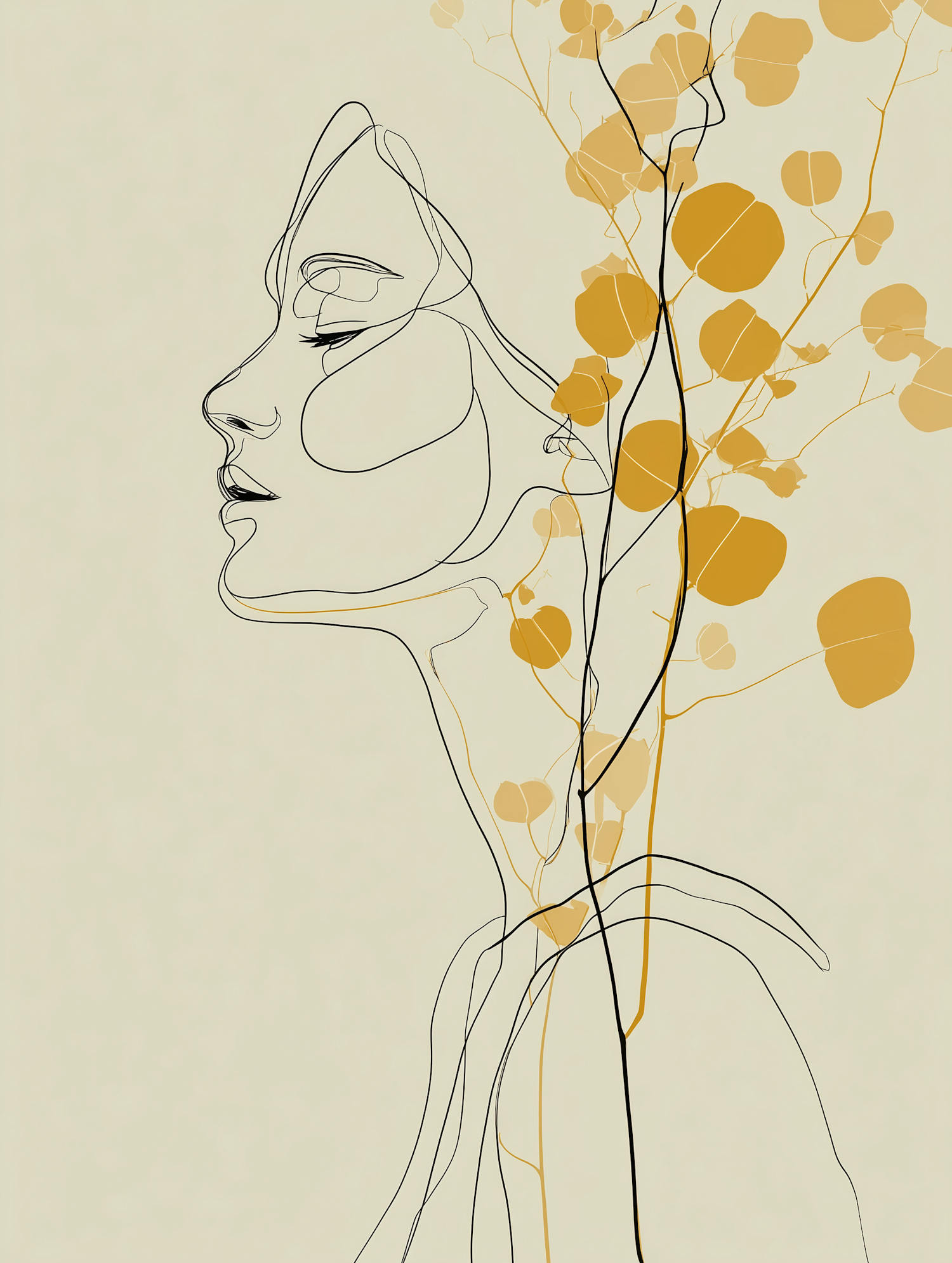 Minimalist line art of a serene woman's profile blended with golden botanical elements on a soft beige background.