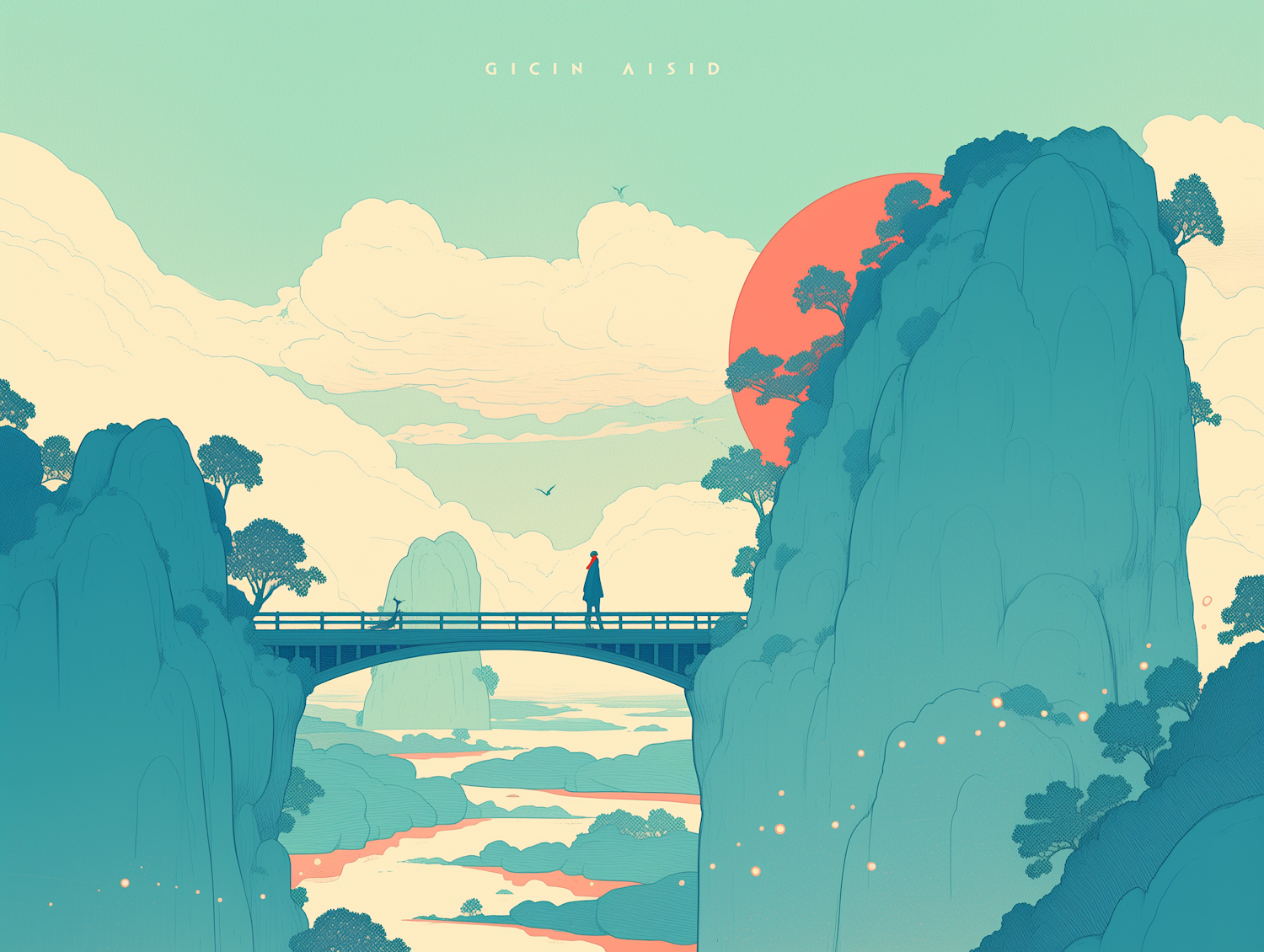 Serene landscape illustration with a lone figure on a bridge, pastel cliffs, and a setting sun. Tranquil and dreamlike atmosphere.