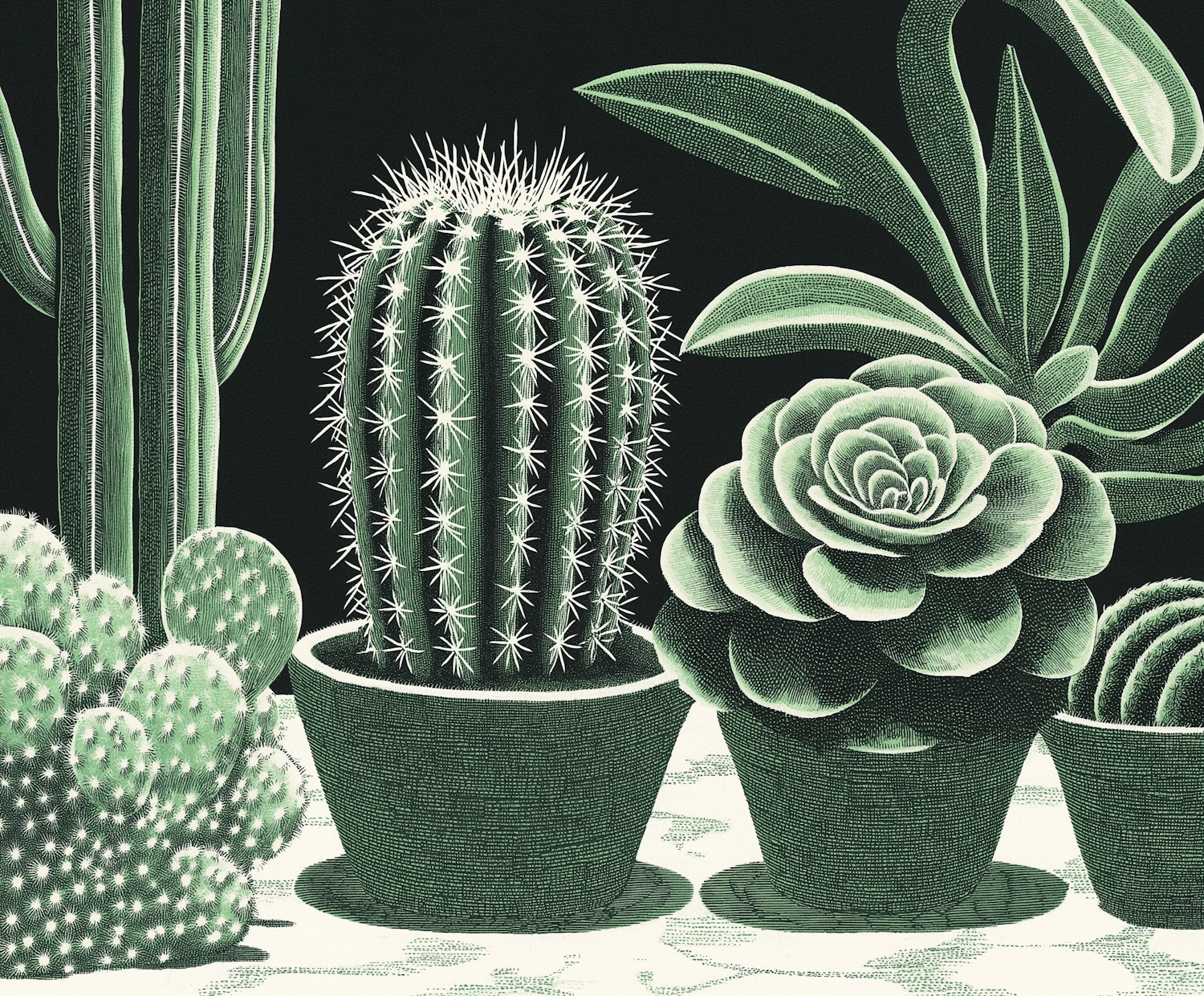 Intricate illustration of cacti and succulents in pots, featuring detailed textures and a dark green background.