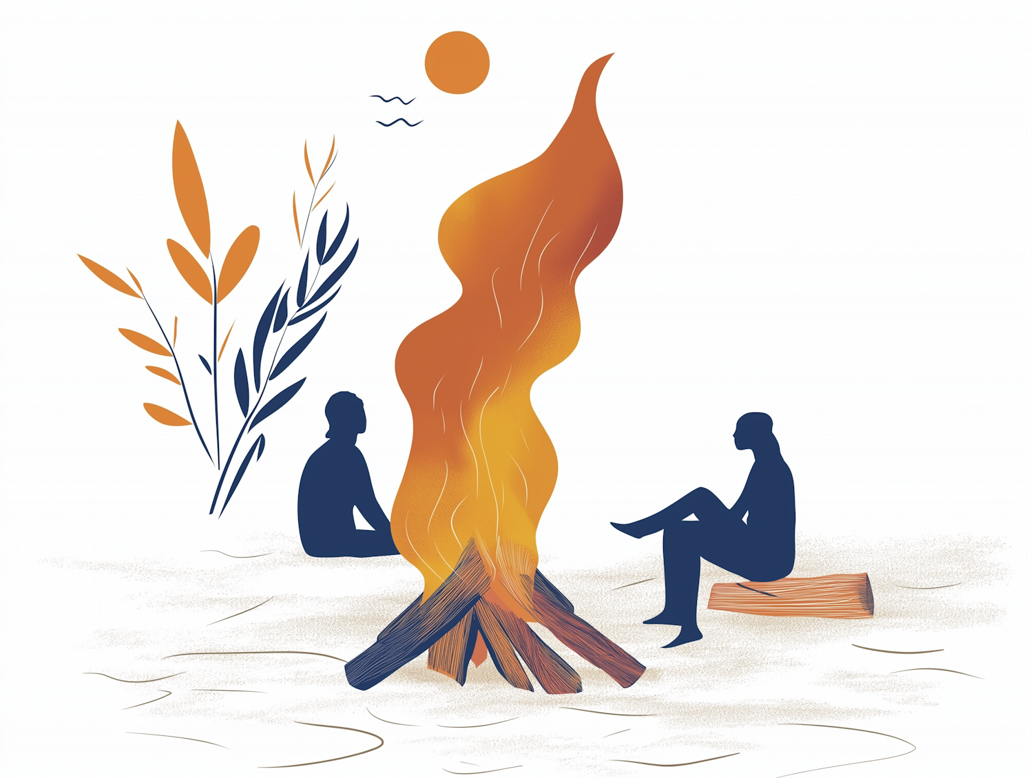 Minimalist illustration of two silhouetted figures by a campfire, with vibrant flames and stylized leaves, set against a serene backdrop.