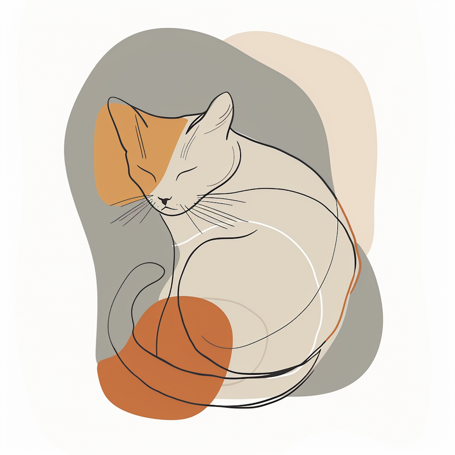 Minimalist cat illustration with soft beige and orange hues, set against abstract gray and beige shapes. Peaceful and modern design.